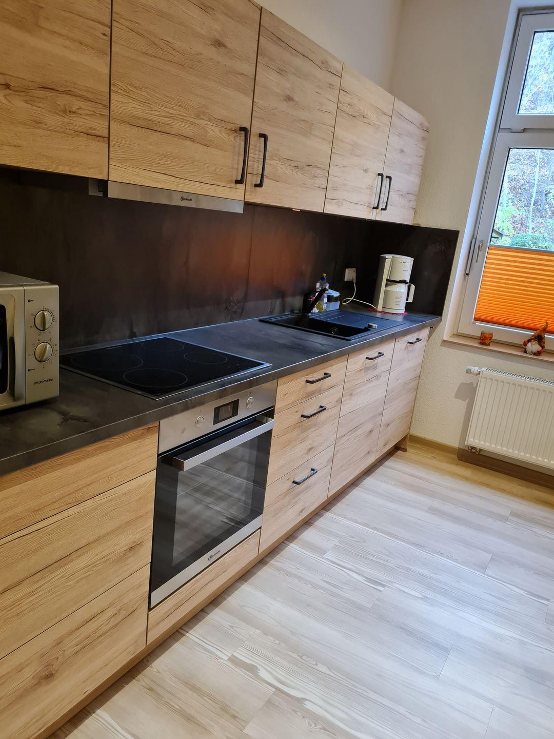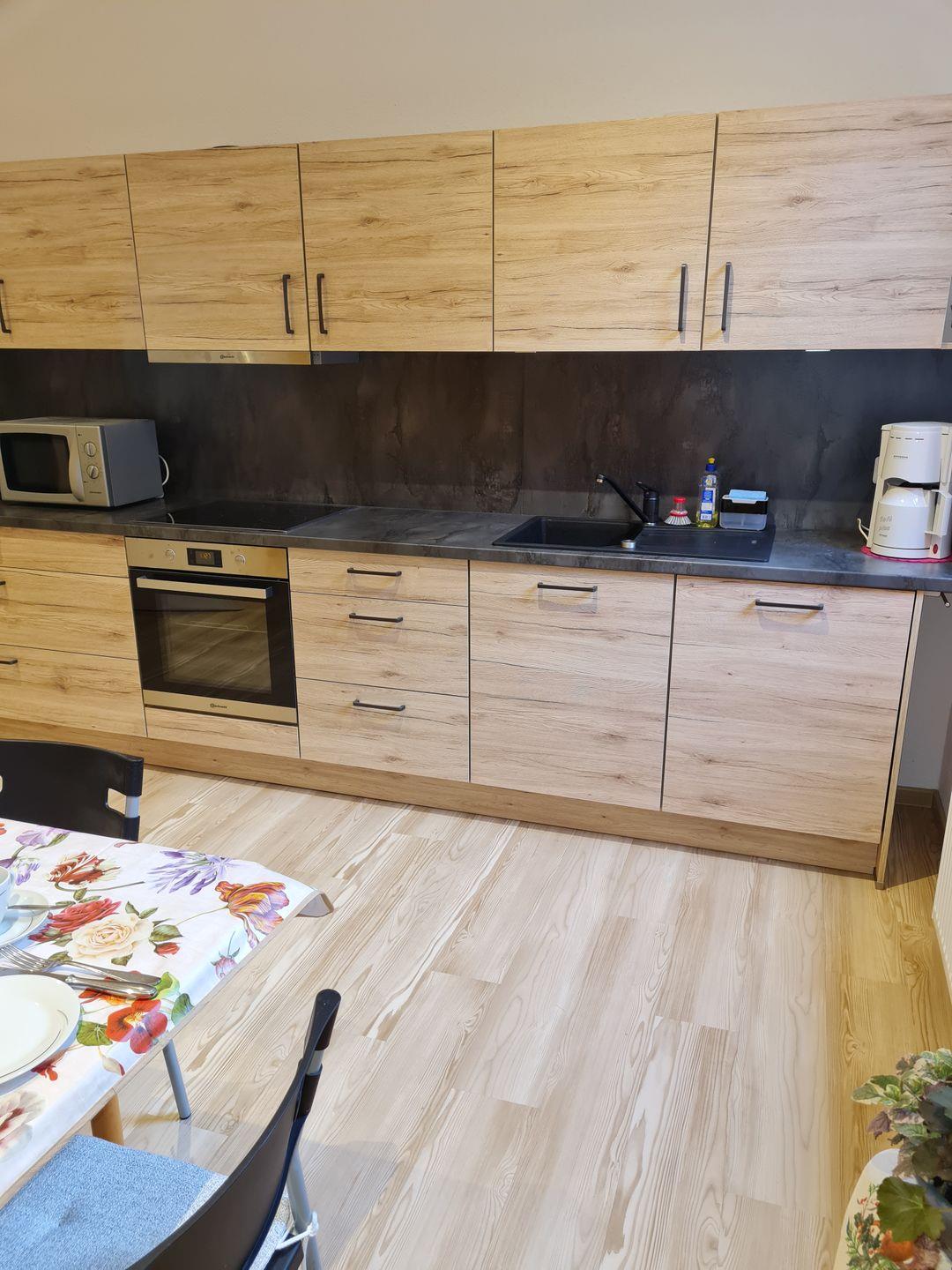 Die sehr geräumige, voll ausgestattete Küche ist modern eingerichtet. Spülmaschine, Cerankochfeld, Backofen, Mikrowelle, Kaffeemaschine und weitere Elektrogeräte stehen dort bereit um leckere Mahlzeiten zu bereiten.