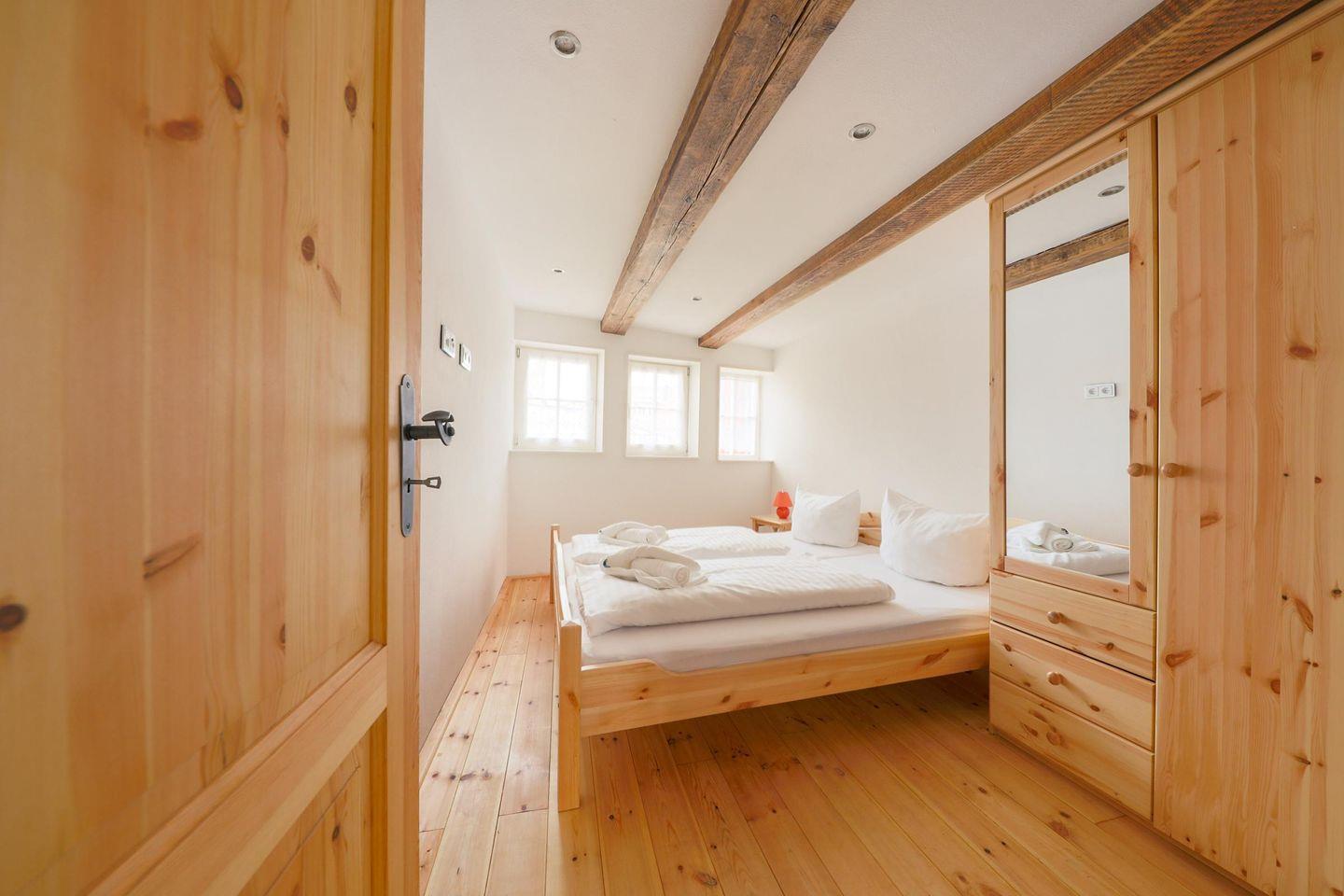Im nächsten Stockwerk befindet sich ein Schlafzimmer mit Doppelbett und Kleiderschrank. Es steht Ihnen hier noch ein Tageslichtbad mit ebenerdiger Dusche, Waschbecken und WC zur Verfügung. Im obersten Stockwerk befindet sich das zweite Schlafzimmer mit zwei Einzelbetten.