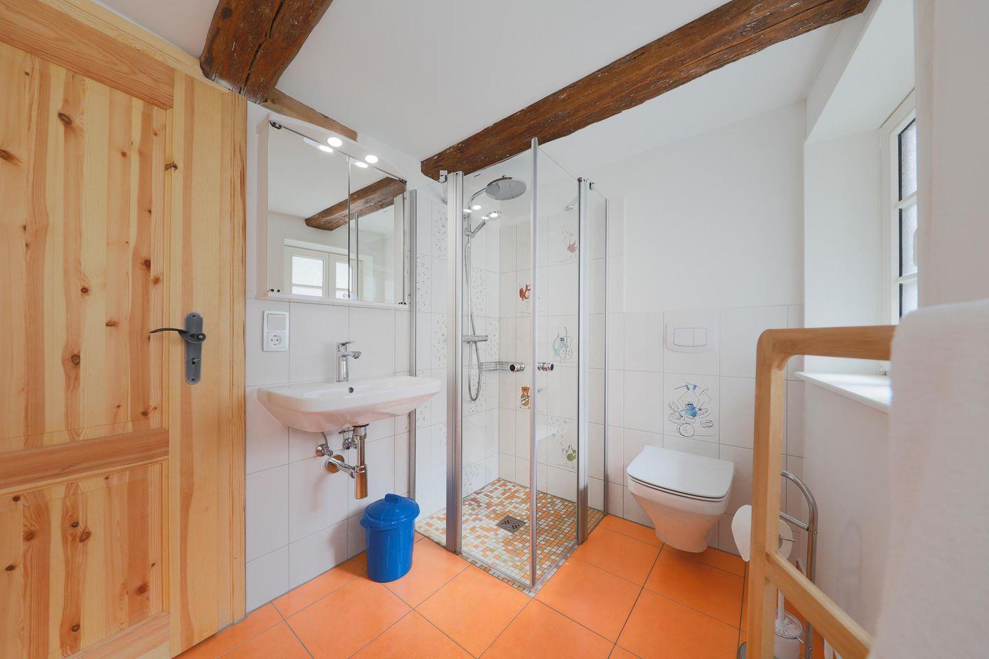Die Ferienwohnung verfügt im Erdgeschoss über eine große Wohnküche mit einer Eckbank und Stühlen. Die Küche ist ausgestattet mit Herd, Backofen, Kühlschrank mit Tiefkühlfach, Kaffeemaschine sowie einem Toaster, Wasserkocher, ausreichend Geschirr, Gläser und Besteck. Ebenfalls im Erdgeschoss befindet sich ein Badezimmer mit Dusche und einer kleinen Badewanne, WC und Waschbecken.