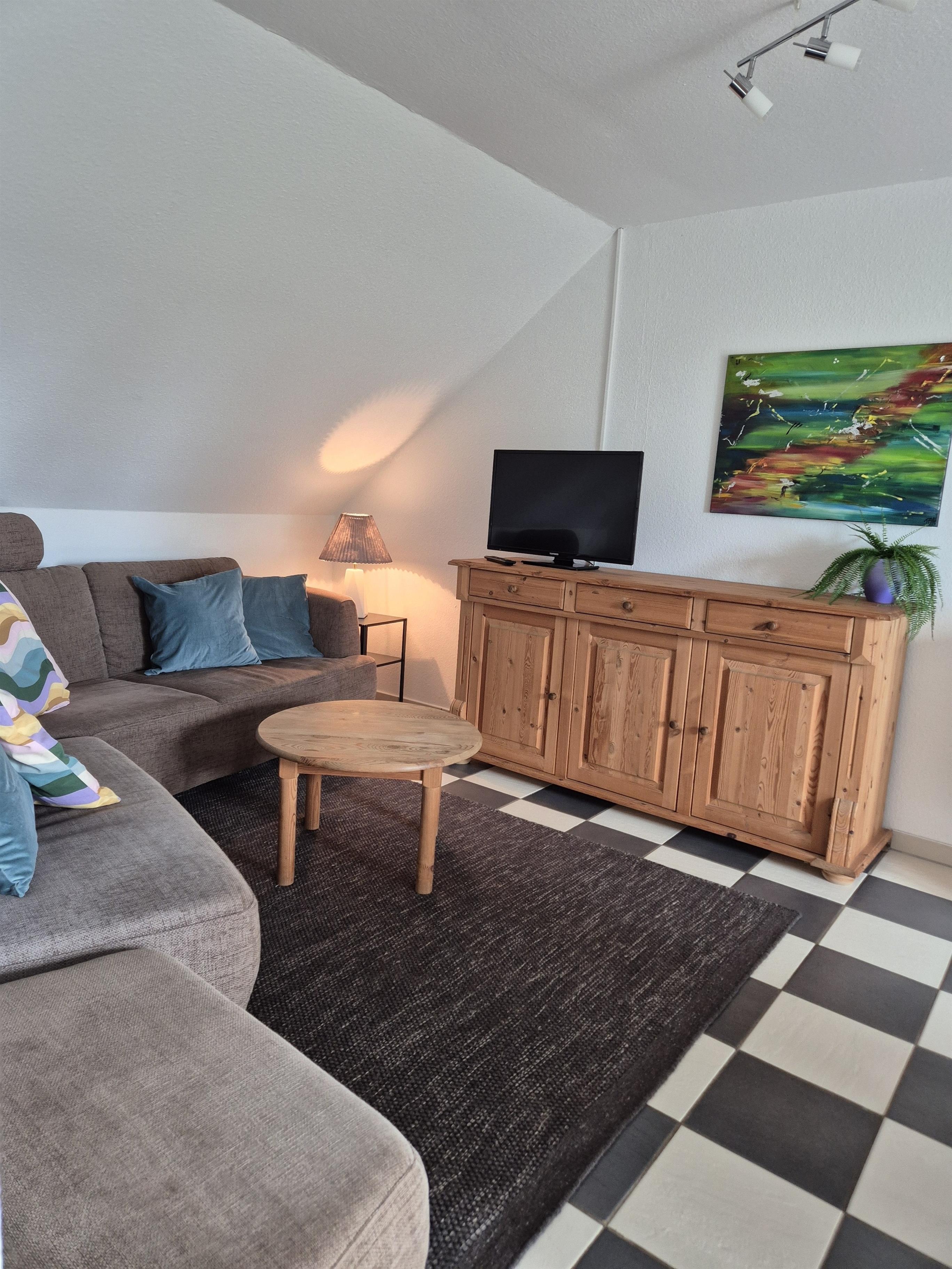 Beim Betreten der Wohnung gelangen Sie über den Flur in den gemütlichen Wohnbereich, der mit einer bequemen Couch und einem Flachbildfernseher ausgestattet ist. Von hier aus haben Sie Zugang zum Balkon, auf dem Sie die malerische Umgebung und die frische Luft genießen können.