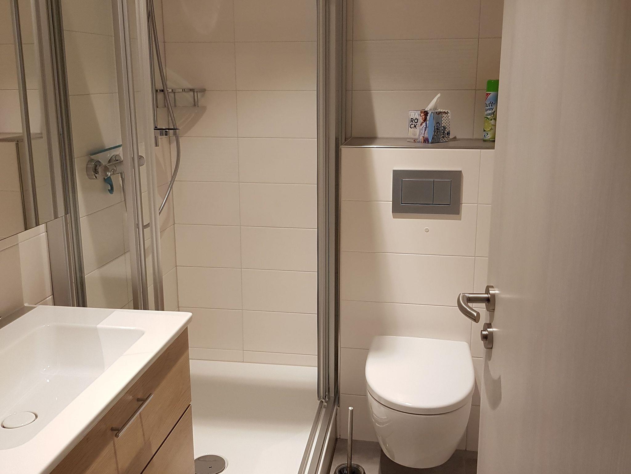 Das Bad ist auch 2020 saniert worden. Fön und Handseife sowie ein Kosmetikspiegel sind vorhanden.