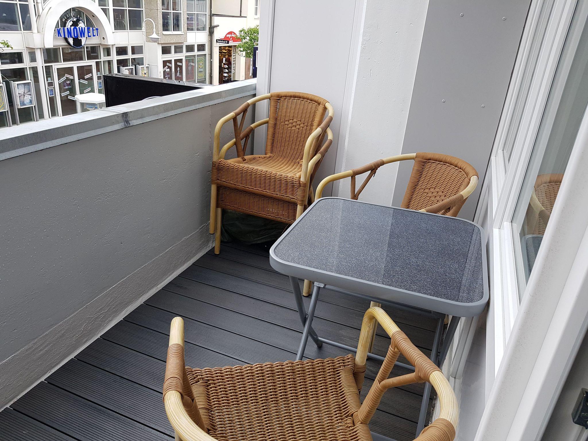 Auf dem Balkon befinden sich ein kleiner Tisch, 4 Stühle und ein Sonnenschirm.