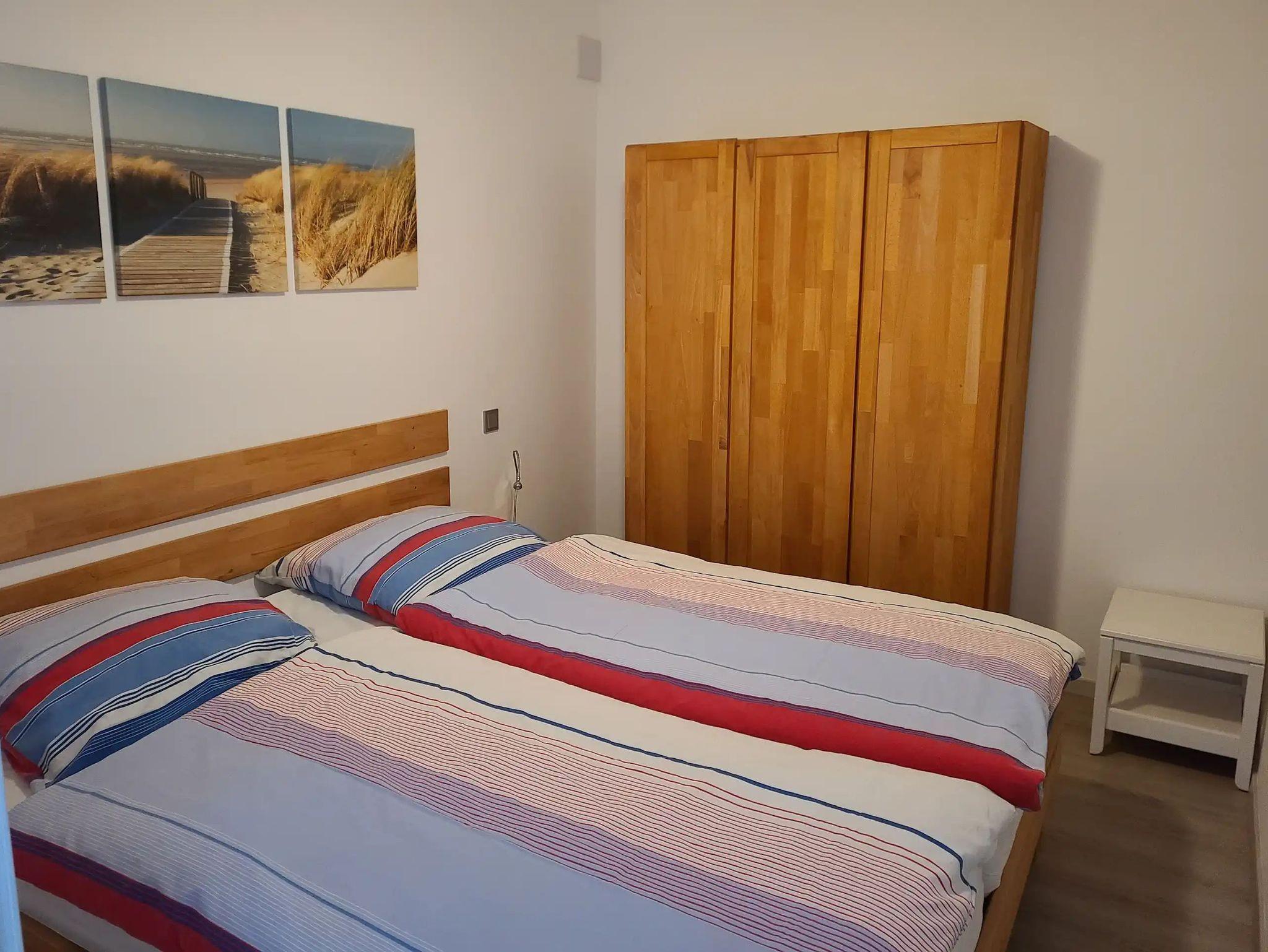 Es gibt ein Schlafzimmer mit Doppelbett (1,80m) Kleiderschrank und Schiebetür,
