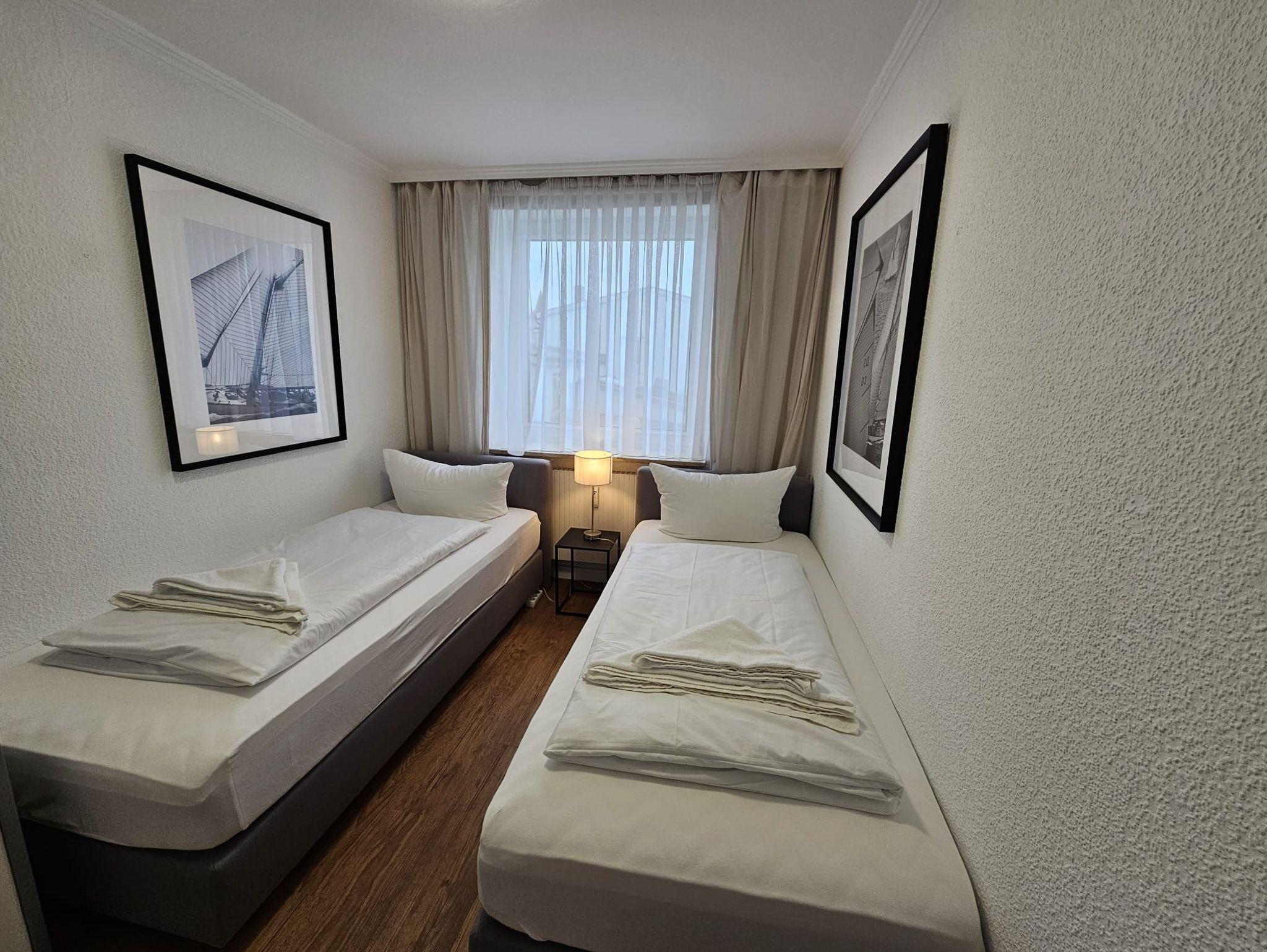 Ein Schlafzimmer mit hochwertigem Boxspringbett (90x200) und offenem Fußende laden zum erholsamen Schlaf ein. Die auseinander stehenden Betten können zusammen gestellt werden. Zusätzlich ist das gemütliche Schlafzimmer mit Nachttischen, Leselampen, Kleiderschrank ausgestattet. Die Betten sind für Sie bezogen.