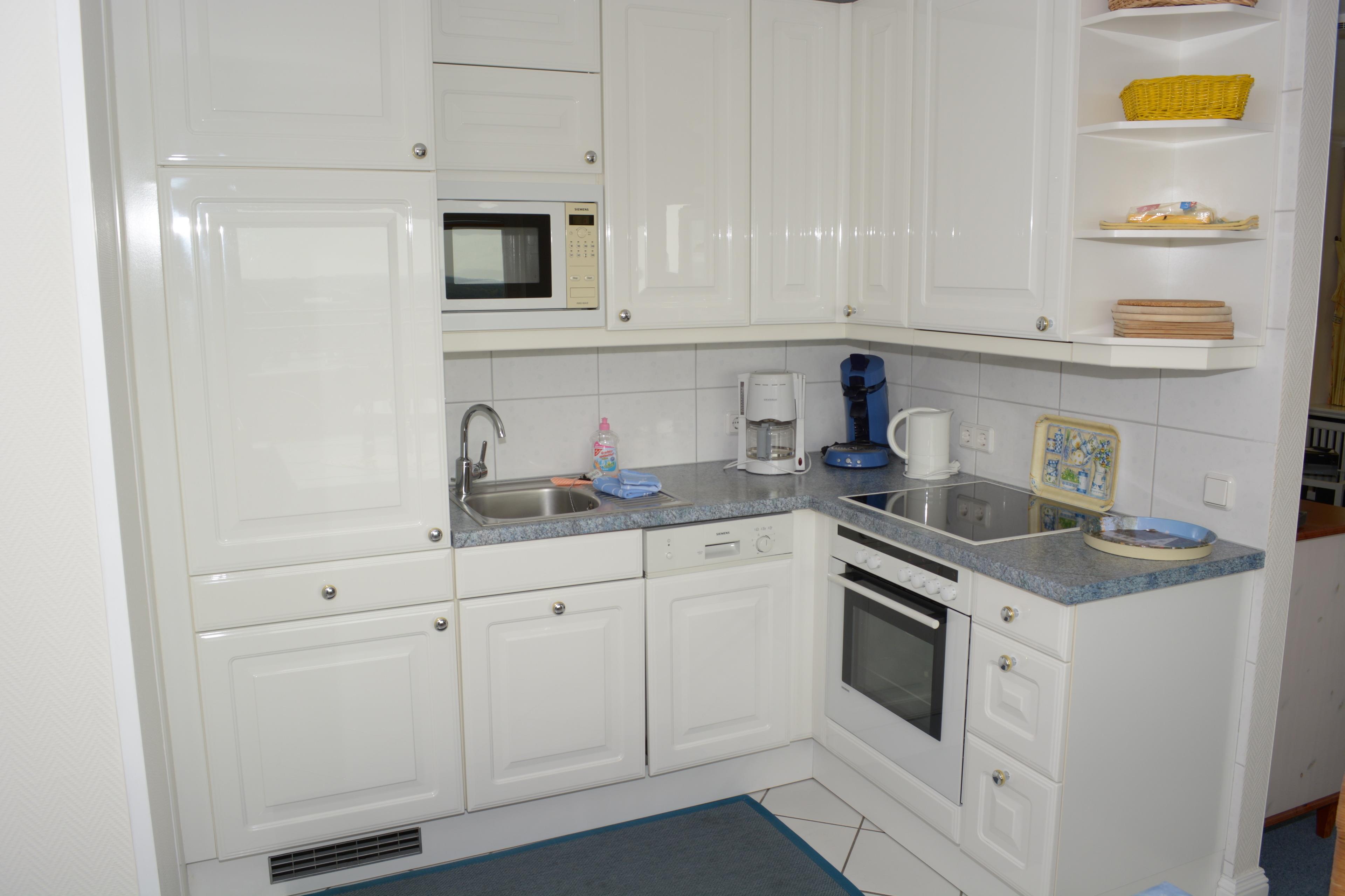Die hochwertige, weiße Hochglanzküche ist mit Spülmaschine, Mikrowelle, Ceranfeld und Backofen ausgestattet.