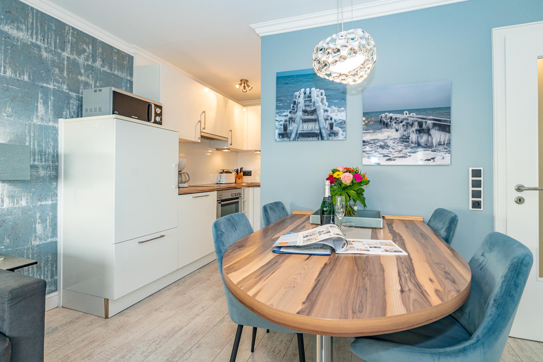 Moderne 2-Zimmer-Nichtraucher-Ferienwohnung, ca. 45 qm, in der 3. Etage, zur Seeseite mit schönem Meerblick, für max. 4 Personen, mit Westloggia (Nachmittagssonne, mit Balkonmöbeln und Auflagen).