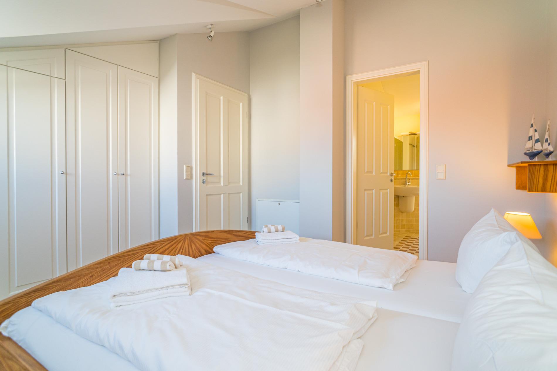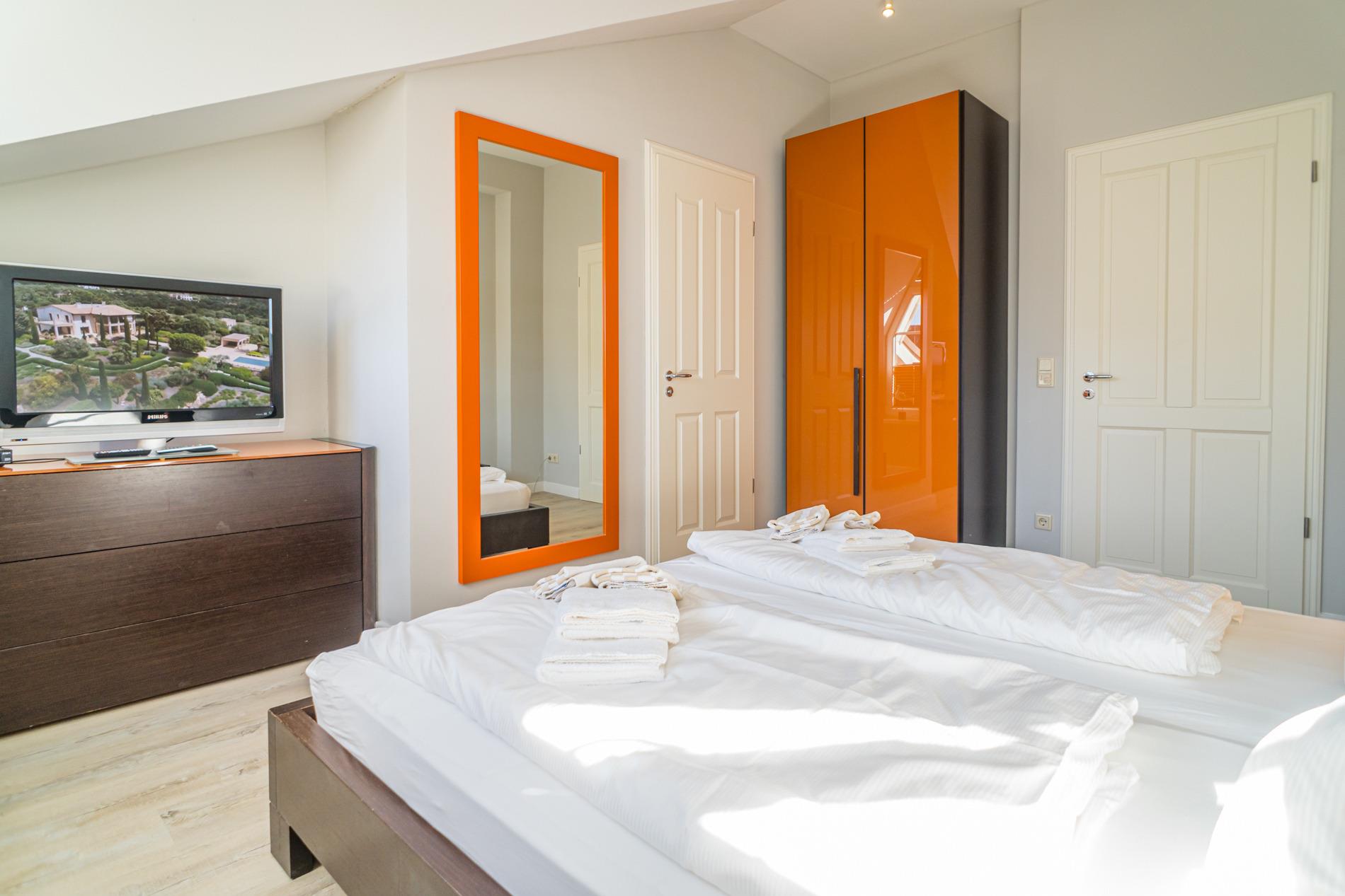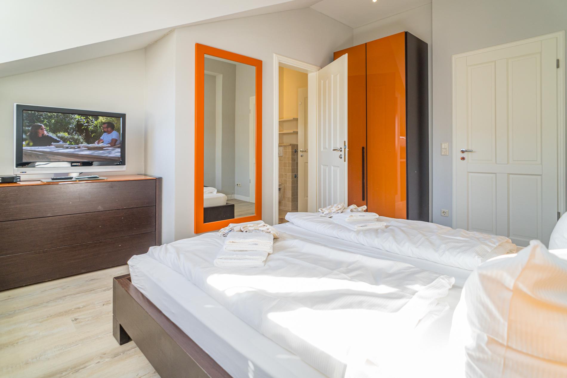 Es gibt zwei weitere geräumige Schlafzimmer, jeweils mit einem guten Doppelbett (0,90 x 2,00 m jeweils mit zwei Einzelmatratzen) und ein schickes Duschbad/WC mit Föhn. Eines der beiden Schlafzimmer ist zusätzlich mit einem Flachbildfernseher ausgestattet.