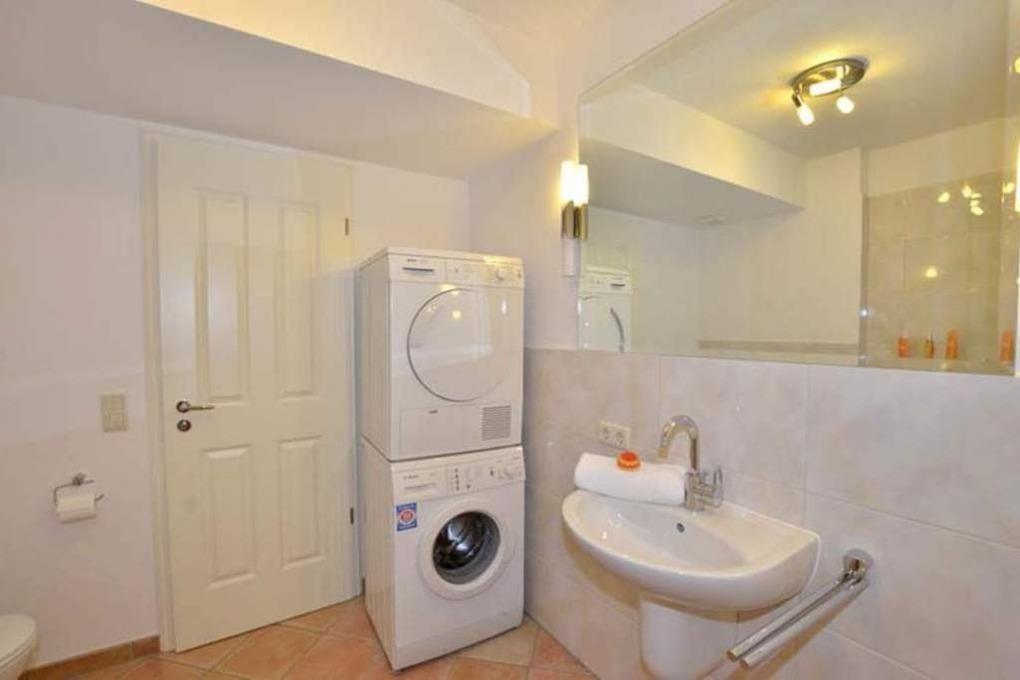 Das 3. großzügige Schlafzimmer mit Doppelbett (1,00 m x 2,00 m mit zwei Einzelmatratzen) hat ein Wannenbad/WC en Suite mit Waschmaschine und Trockner.
