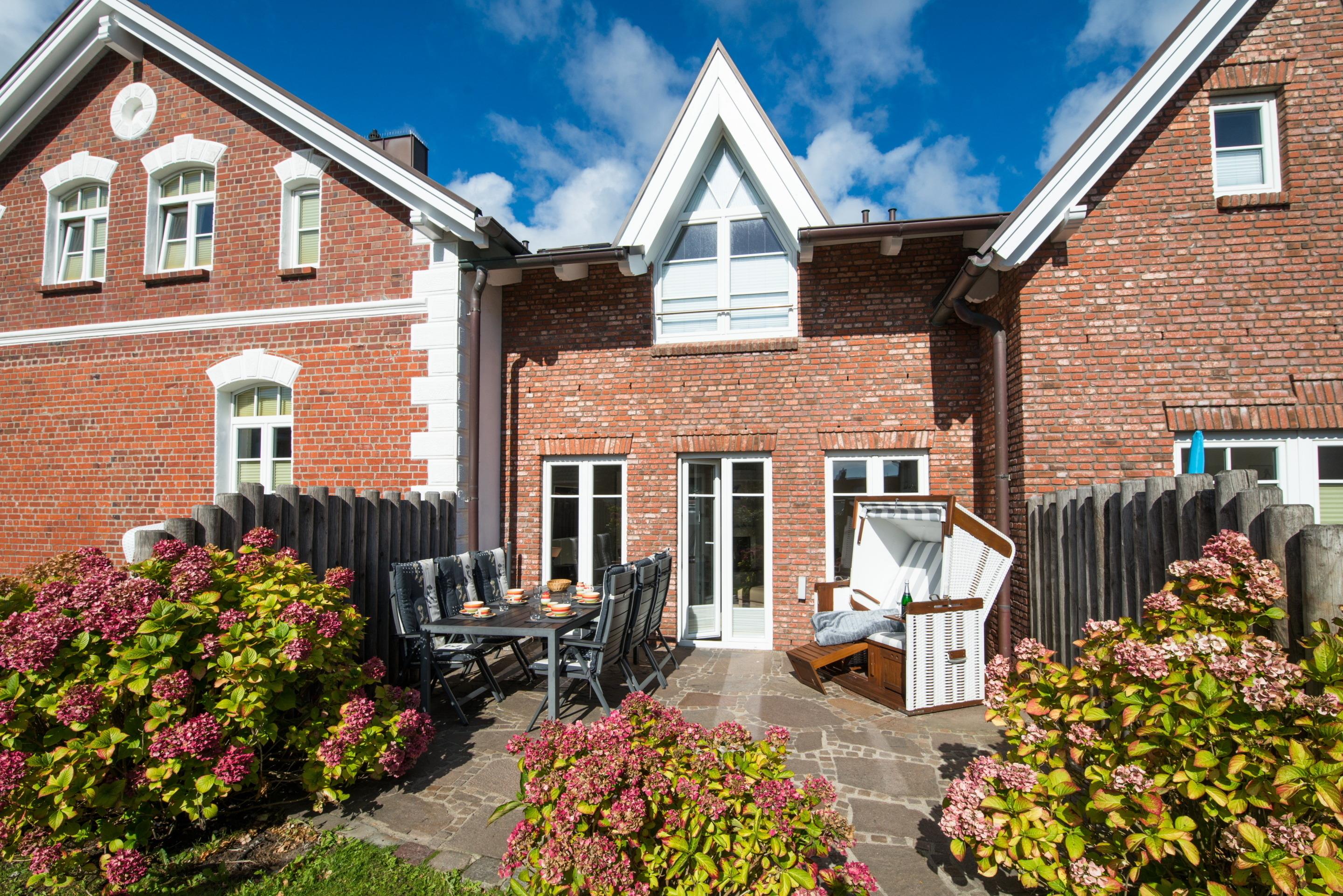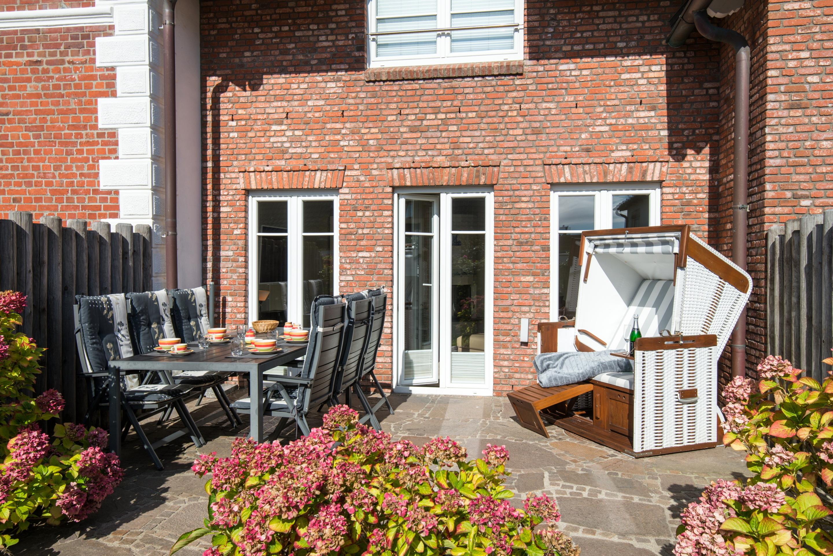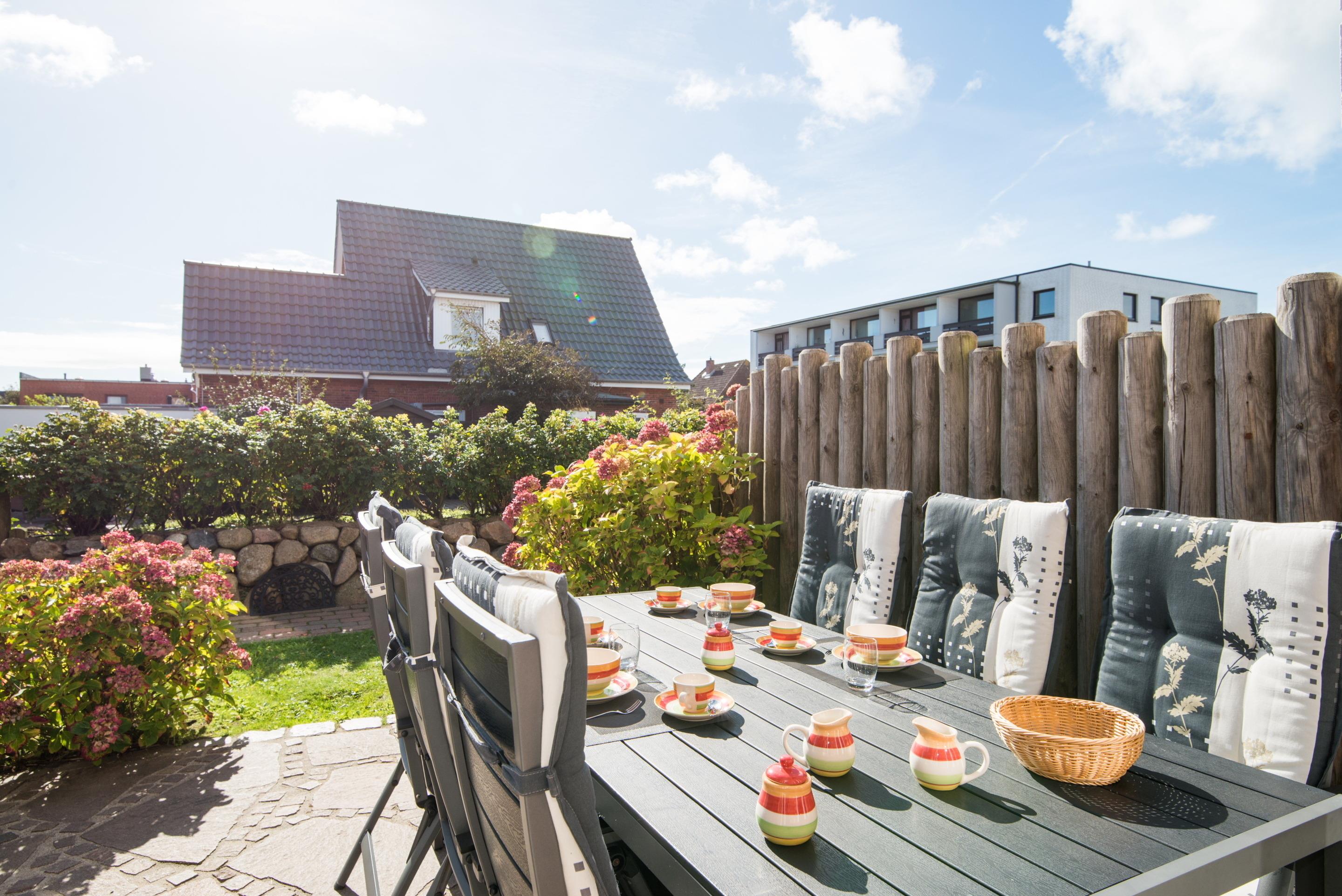 Die nach Süden ausgerichtete Sonnenterrasse bietet einen Strandkorb und Gartenmöbel mit Auflagen + Sonnenschirm.