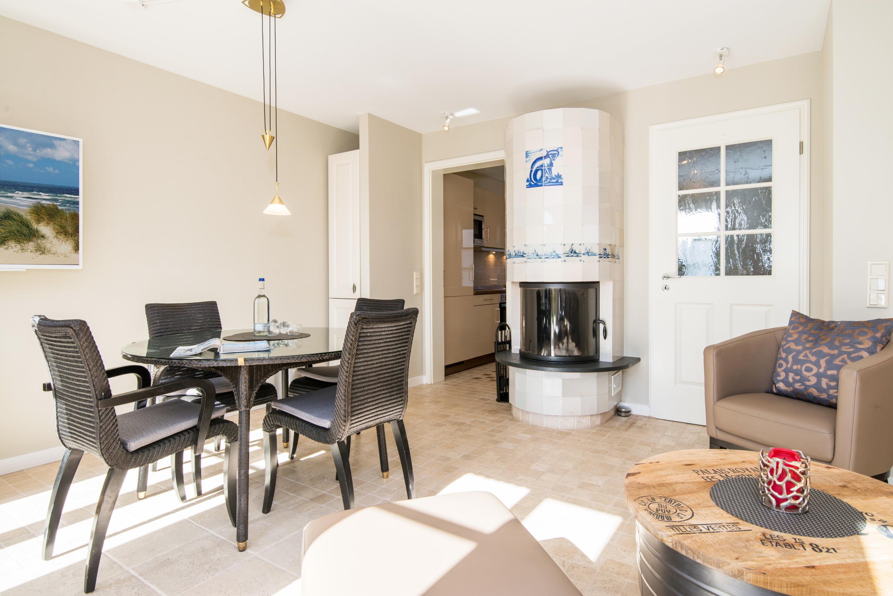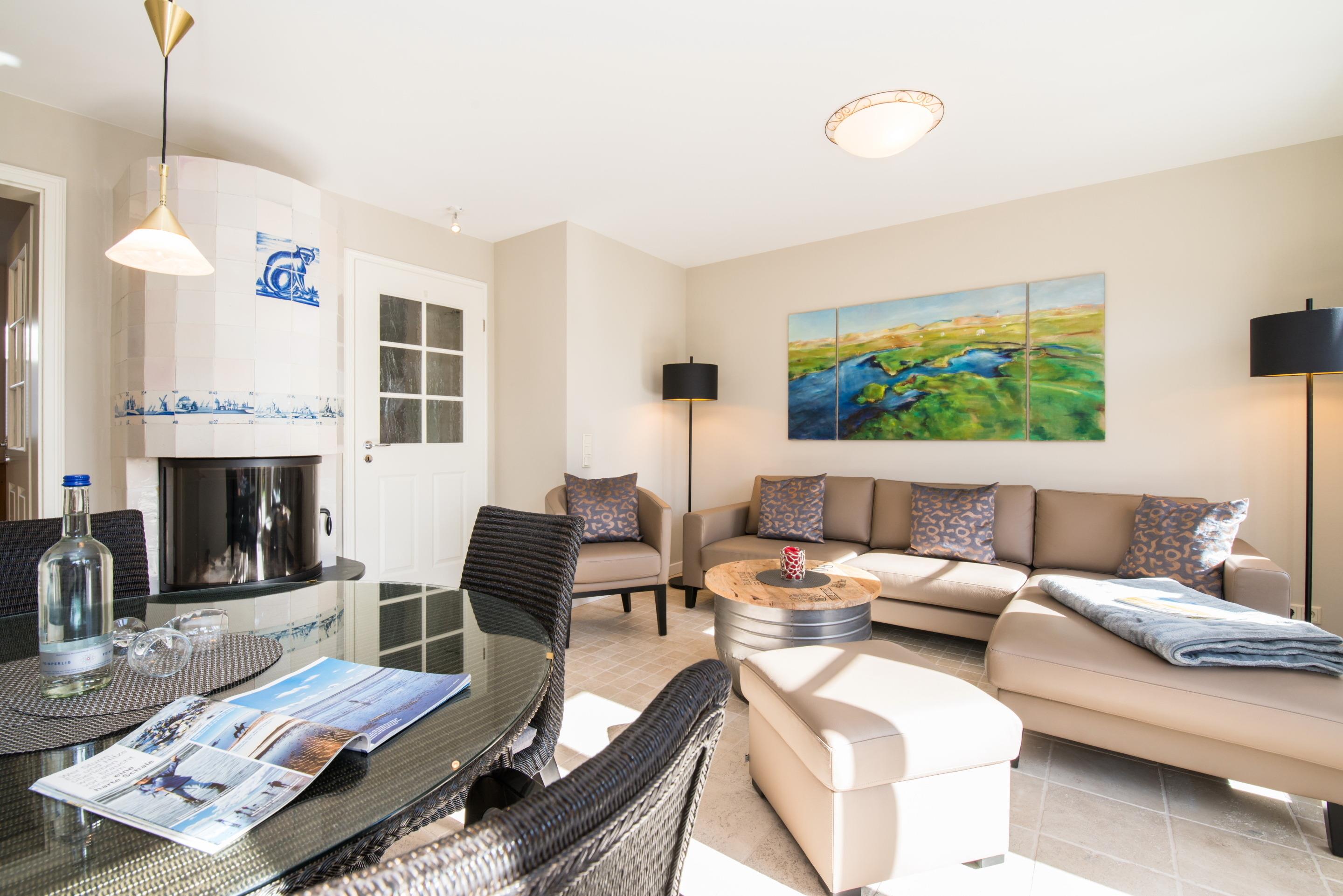 Das Wohnzimmer ist mit einem Ecksofa, zwei Sesseln, einem Fußhocker, einem Essplatz und einem aufwendig gemauerten Kamin (umrahmt von echten Delfter-Fliesen) ausgestattet.