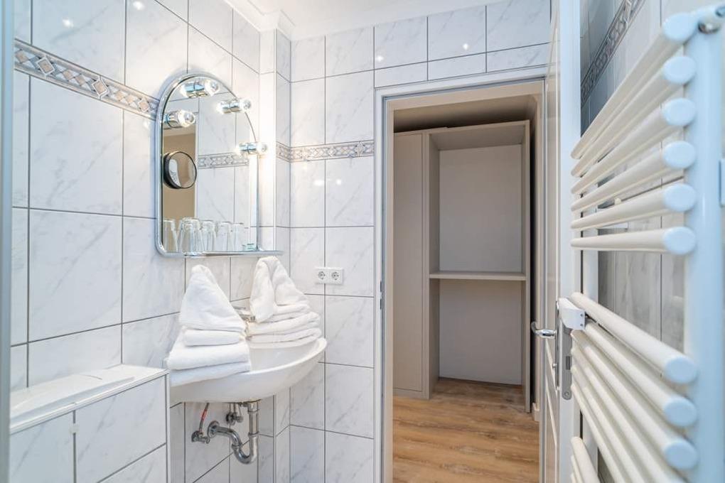 Im Bad mit abgehängter LED-Licht-Decke befindet sich die Dusche, der Waschtisch und WC.
