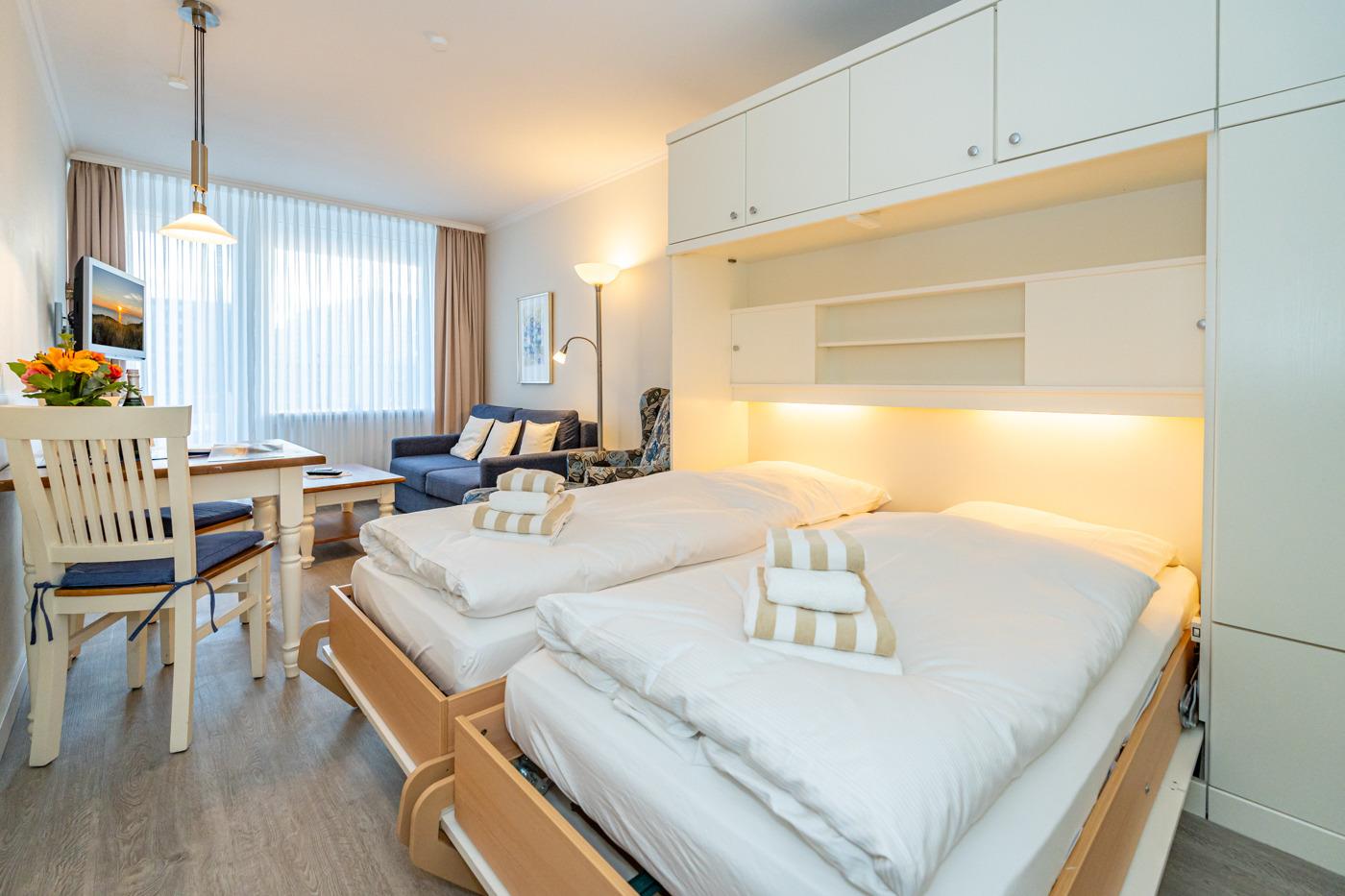Der kombinierte Wohn-/Schlafraum ist mit einer gemütlichen Sitzgarnitur, einer Essecke, Doppelschrankbetten (einzeln klappbar), einem Flachbild-TV und einem Radio/CD-Player ausgestattet.