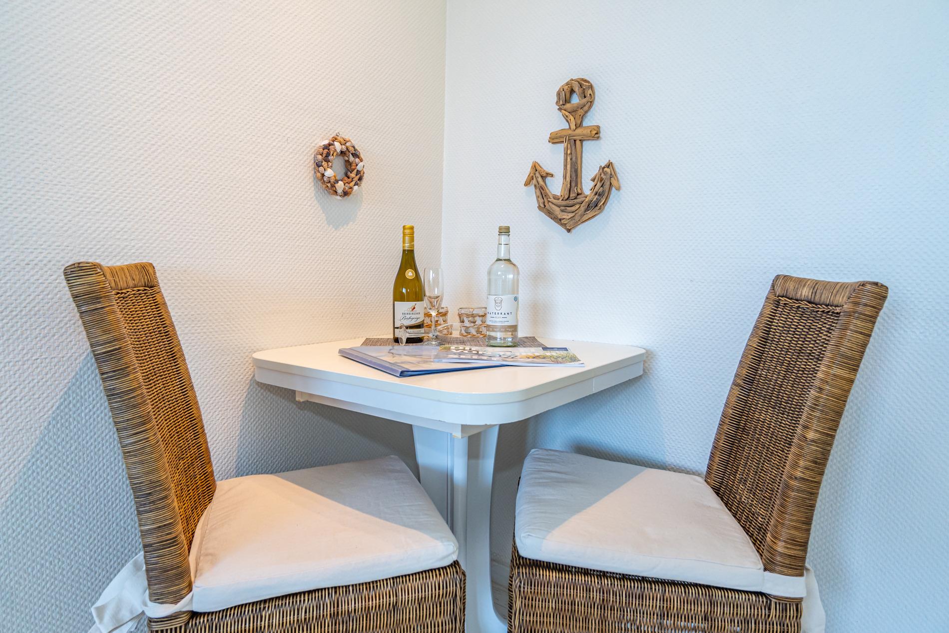 1-Zimmer-Nichtraucher-Ferienwohnung (ca. 25 qm) in der 1. Etage zur Seeseite mit Westloggia (Nachmittagssonne, mit Balkonmöbeln und Auflagen) für max. 2 Personen.