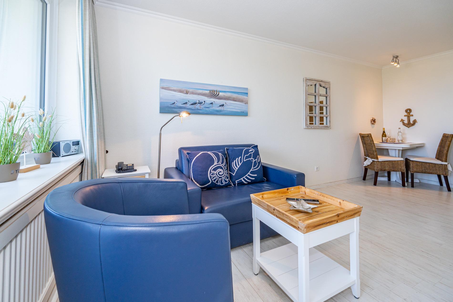Vom Vorflur mit Garderobe und Küchenzeile gelangt man in das kombinierte Wohn-/Schlafzimmer (mit Austritt zum Balkon) und in das Duschbad/WC. Der Wohn-/Schlafraum mit neuem Designerboden in Holzoptik besteht aus einem hochwertigen 2-Sitzer-Ledersofa und einem Ledersessel von Bielefelder Werkstätten, einem separaten Essplatz (Eckbank), Doppelschrankbett (Betten sind einzeln ausklappbar), Kabel-Flachbild-TV, Radio/CD. Die moderne Küchenzeile hat einen Geschirrspüler, ein Cerankochfeld, eine Mikrowelle mit Grillfunktion und einen Kühlschrank mit 3*-Gefrierfach. Kaffeemaschine, Wasserkocher und Toaster gehören zur Grundausstattung.
