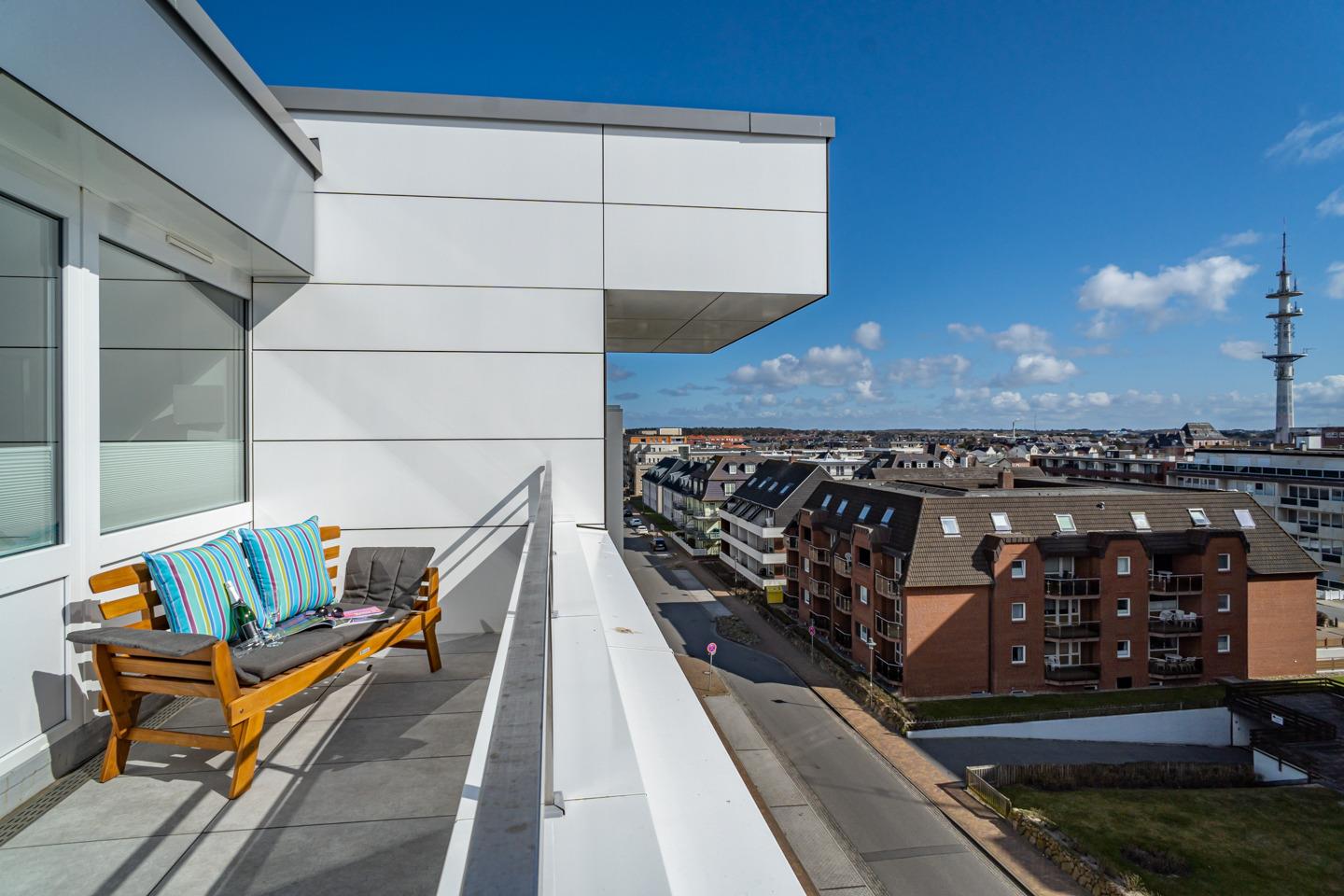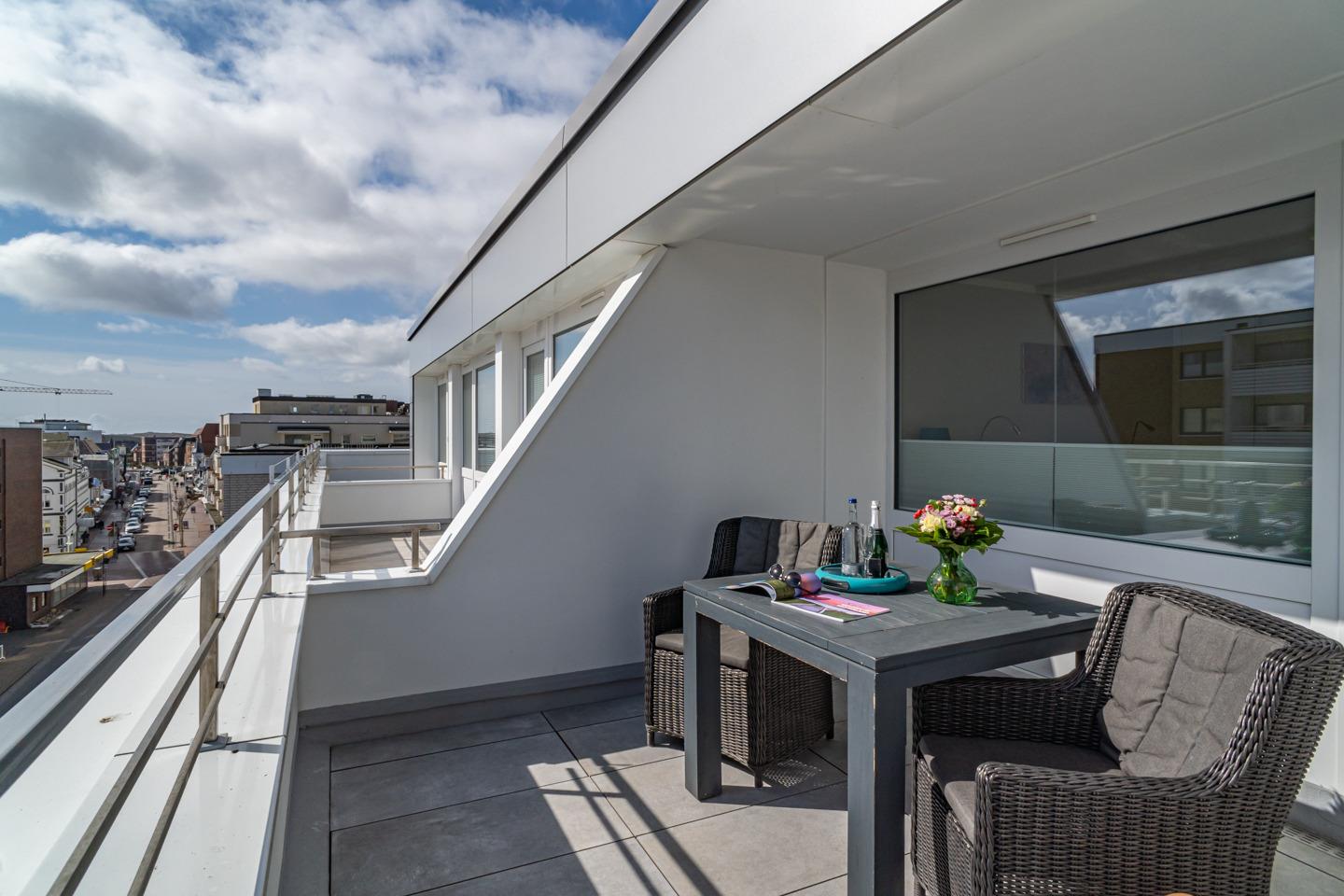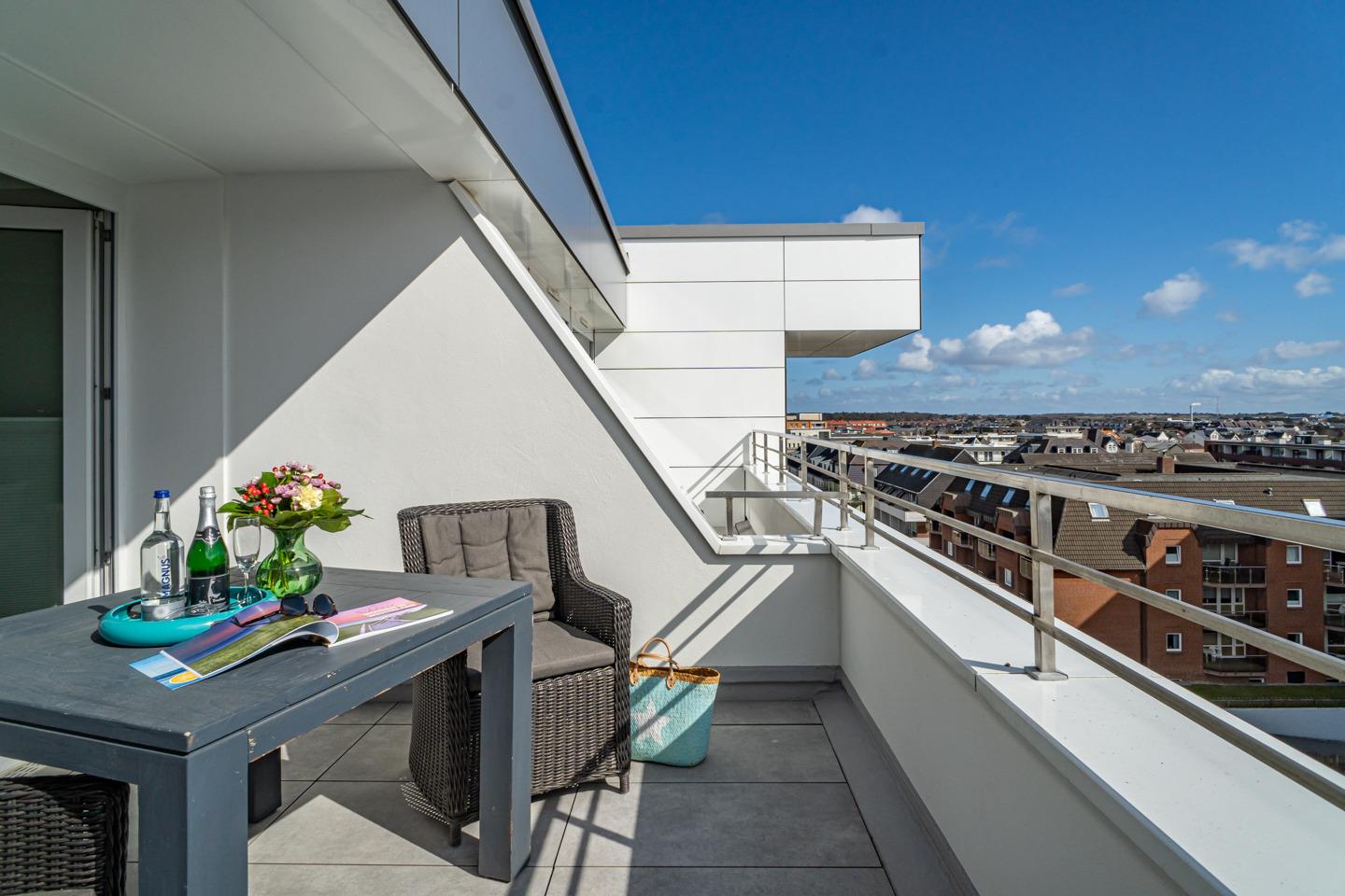 Modern ausgestattete 2-Zimmer-Nichtraucher-Ferienwohnung, ca. 51 m², 5. Etage mit 2 Dachterrassen zum Osten (Morgensonne, mit Balkonmöbeln und Auflagen) für 2 Erwachsene und max. 2 Kinder.