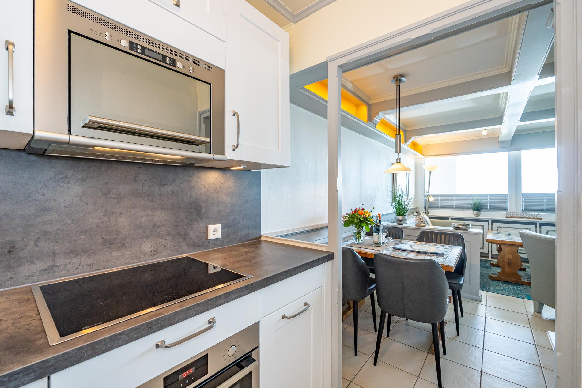 Der Wohnraum besteht aus einer besonders hochwertigen Sitzgarnitur von Bielefelder Werkstätten (2-Sitzer-Couch und ein Sessel mit Fußhocker), einem Essplatz und einer schönen, zum Wohnraum hin geöffneten Küche.