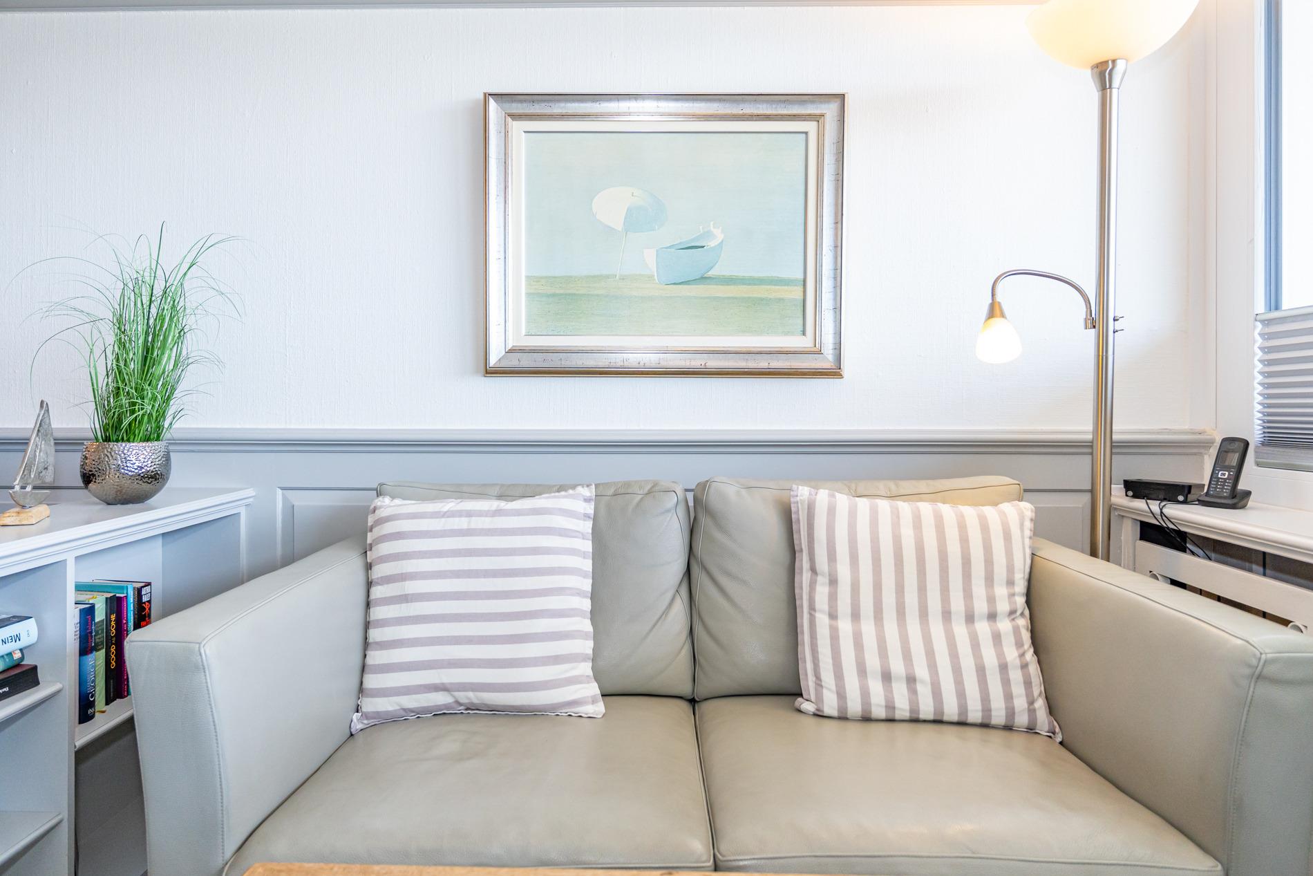 Die im modernen Friesenstil gehaltene Wohnung ist mit ihren aufwendigen Tischlereinbauten und handgemalten Sylt-Motiven ein Unikat.