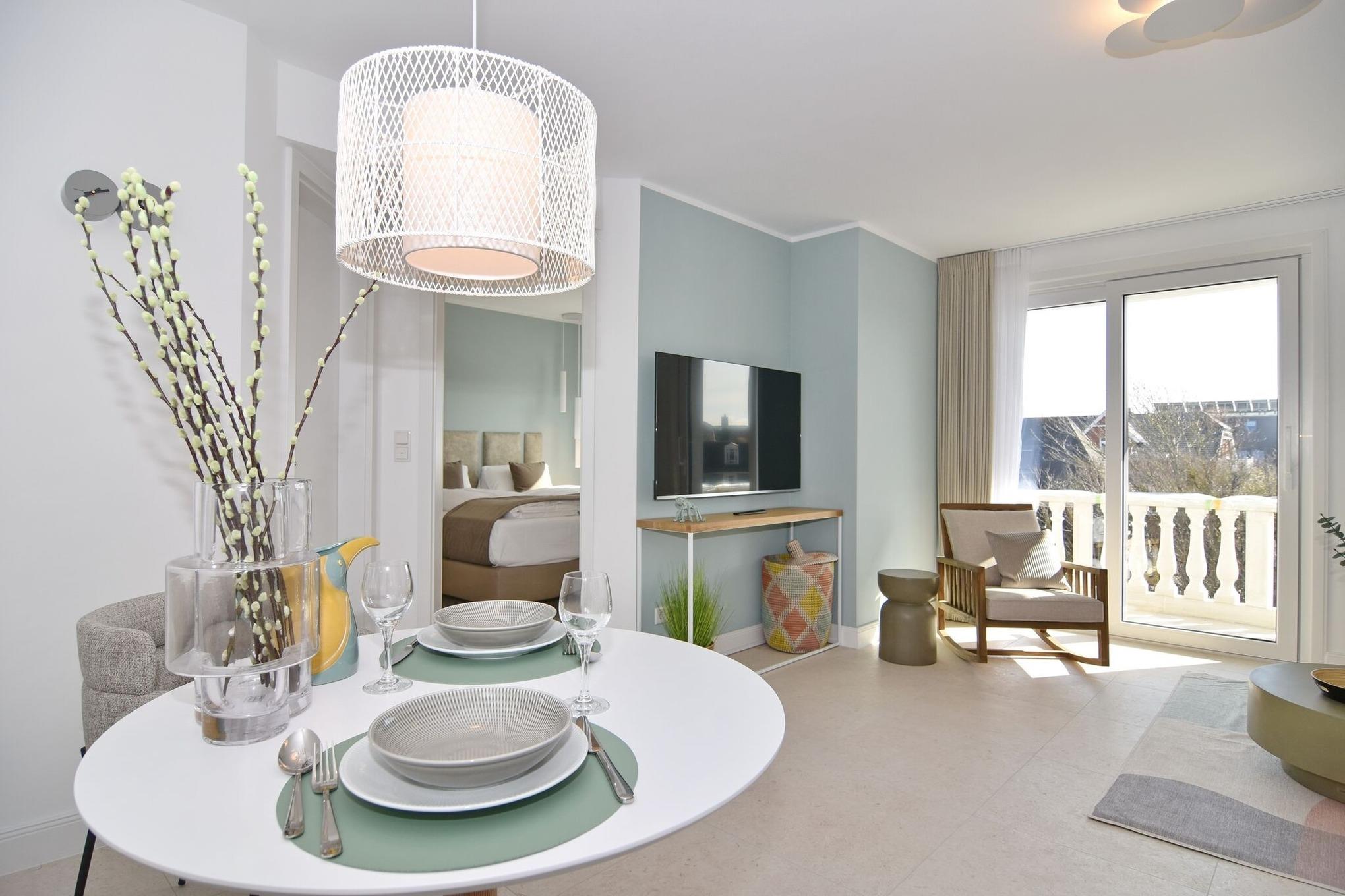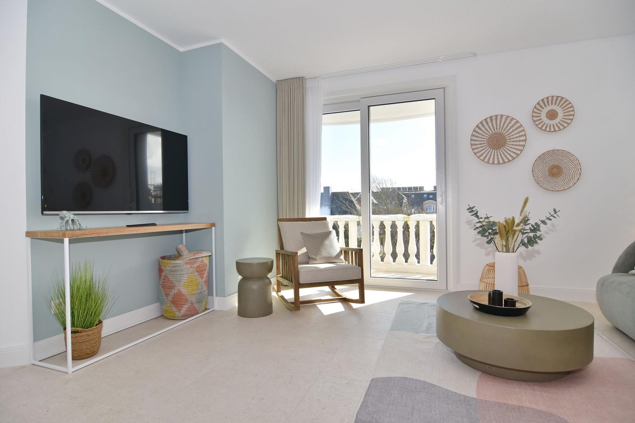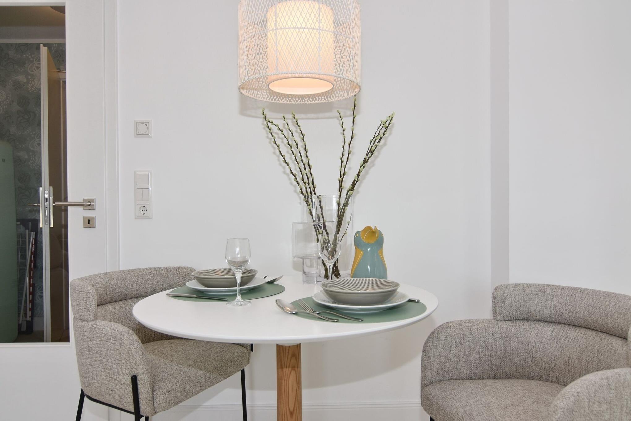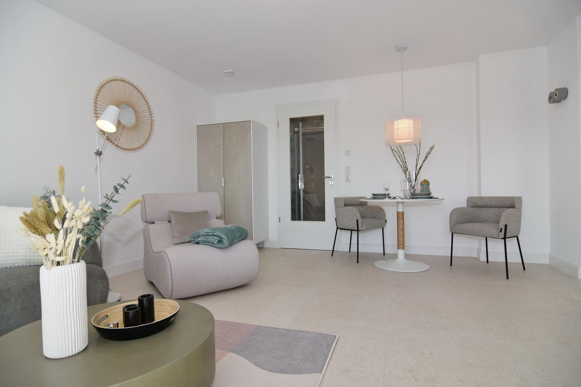 Die hochwertige 2-Zimmer-Wohnung im 2. OG mit ca. 47 qm ist für maximal 2 Personen ausgestattet. Vom Flur mit Küche gelangen Sie in das Wohnzimmer mit möbliertem Südbalkon. Die kleine, aber hochwertige Küche bietet neben Induktionsherd auch Geschirrspüler, Smeg Kühlschrank mit Gefrierfach und Mikrowelle. Die Wohnung bietet Ihnen ein Schlafzimmer und ein Duschbad /WC mit Haar- und Handtuchtrockner. Das Schlafzimmer ist mit einem Boxspringbett (200x200) der Marke FBF, Flat-TV und Einbauschrank ausgestattet. Bis auf das Schlafzimmer sind die Räume mit großformatigen Fliesen versehen.