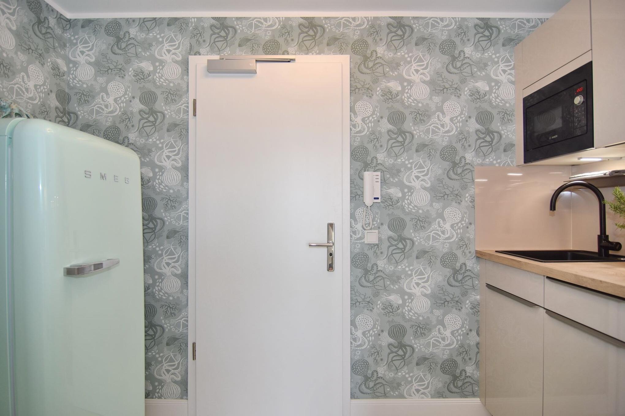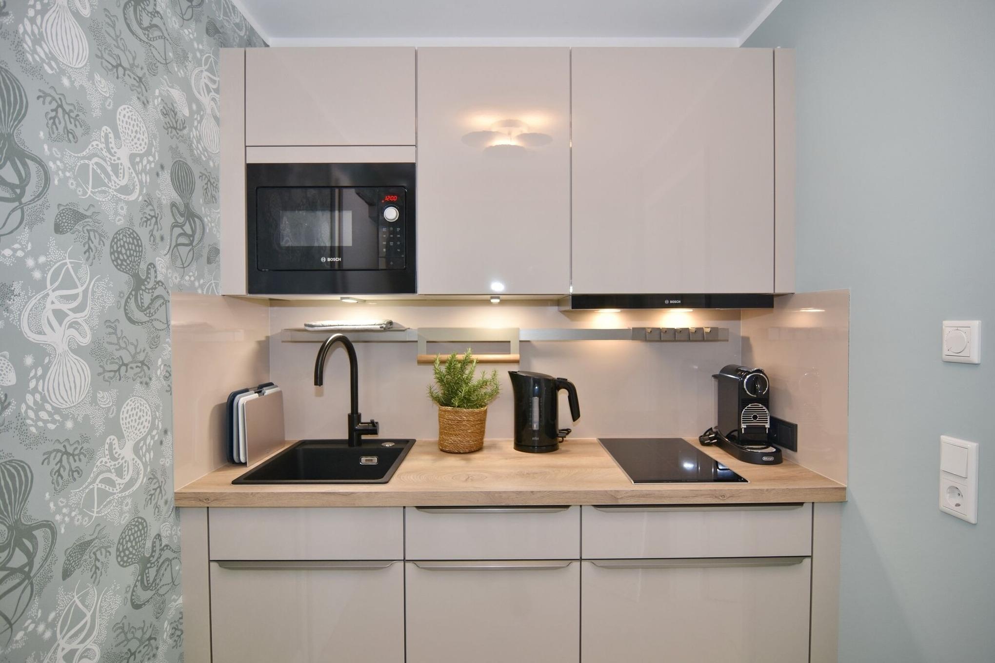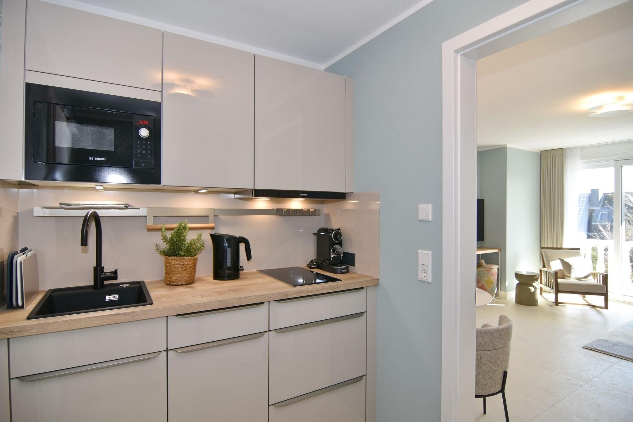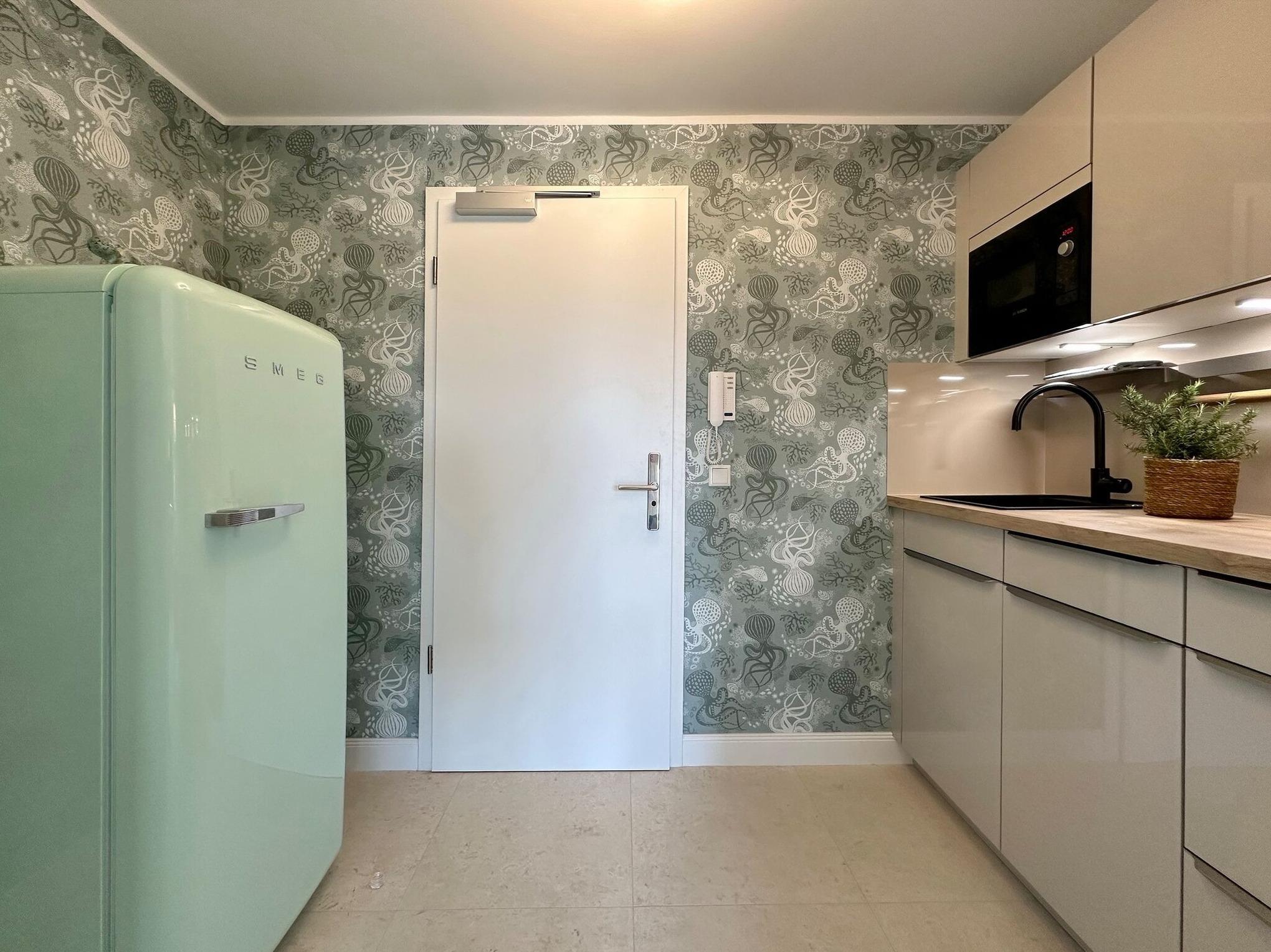 Die hochwertige 2-Zimmer-Wohnung im 2. OG mit ca. 47 qm ist für maximal 2 Personen ausgestattet. Vom Flur mit Küche gelangen Sie in das Wohnzimmer mit möbliertem Südbalkon. Die kleine, aber hochwertige Küche bietet neben Induktionsherd auch Geschirrspüler, Smeg Kühlschrank mit Gefrierfach und Mikrowelle. Die Wohnung bietet Ihnen ein Schlafzimmer und ein Duschbad /WC mit Haar- und Handtuchtrockner. Das Schlafzimmer ist mit einem Boxspringbett (200x200) der Marke FBF, Flat-TV und Einbauschrank ausgestattet. Bis auf das Schlafzimmer sind die Räume mit großformatigen Fliesen versehen.