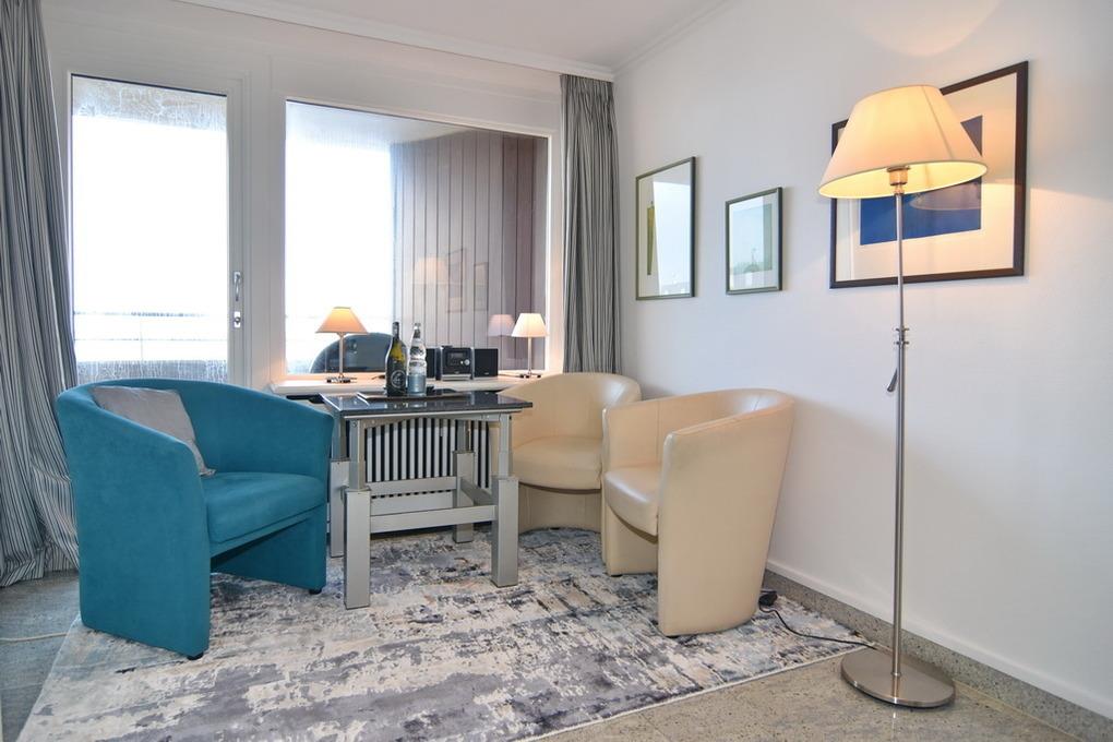 Modernes 1 Zimmer-Ferienwohnung, "Nichtraucher",3 OG.zur Seeseite,ca. 25m²,Haus am Meer. Wohn-/Schlafraum mit Einzelschrankbetten , 2 Sessel und Couchtisch( Höhenverstellbar), Flat-TV, Radio m.CD, Westbalkon mit Meeesblick und Balkonmöbeln, Küchenzeile im Flurbereich mit Mikrowelle, Duschbad/WC. W-LAN ( ohne Gewähr ). Das App ist komplett gefliest. Tierhaltung ist nicht gestattet. Bettwäsche und Handtücher sind zur Anreise aufgezogen. Ein PKW-Stellplatz kann kostenpflichtig zugebucht werden.