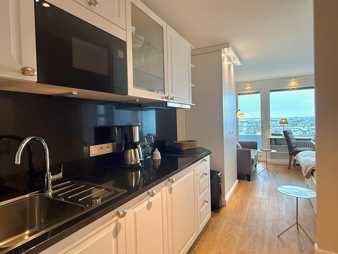 Die frisch renovierte 1-Zimmer-Wohnung ist ca. 30 m² groß und befindet sich im 9. OG[nbsp] des Haus "Metropol" zur Landseite. Sie besteht aus einem kombinierten Wohn- und Schlafzimer mit Doppelbett (160 x 200, 2 Matratzen), Kleiderschrank, 2-Sitzer-Sofa, Essplatz am Fenster, Flat-TV mit Radio, dazu 4 USB-Anschlüsse. Die moderne Küchenzeile mit Geschirrspüler, 2-Plattenherd, Mikrowelle und Kühlschrank mit Gefrierfach ist den Flur integriert. Das Badezimmer verfügt über ein große Dusche, WC sowie einen Waschtisch. Auf dem geschützten Ostbalkon lässt es sich hervorragend in der Sonne frühstücken und den herrlichen Blick über die Insel bis zum Rantum Becken genießen. Internet steht kostenfrei über die hausinterne Anlage zur Verfügung (ohne Gewähr) Tierhaltung und Rauchen sind in der Wohnung nicht gestattet. Ein PKW-Stellplatz kann kostenpflichtig zugebucht werden. Bettwäsche und Handtücher sind zur Anreise aufgezogen.