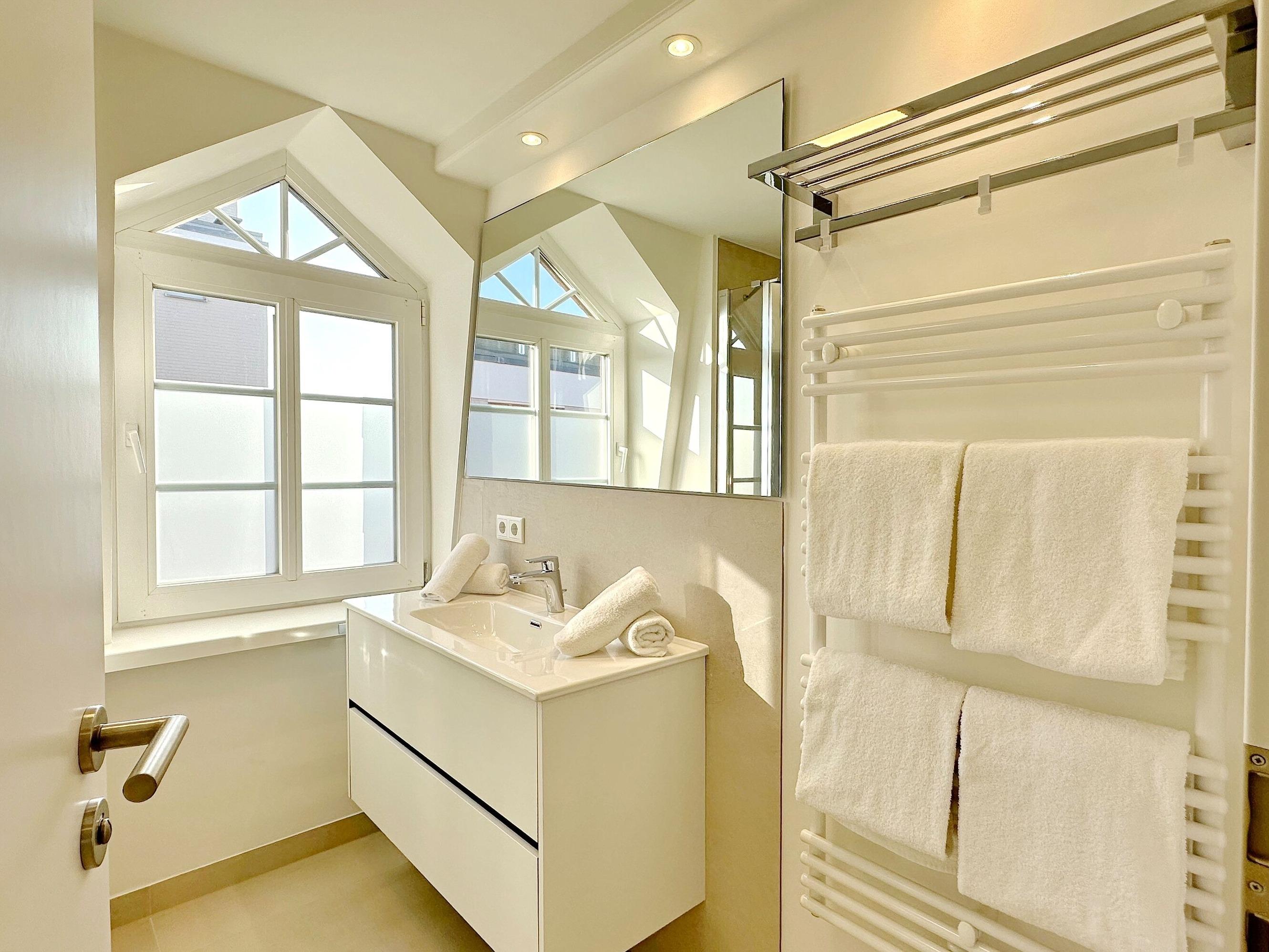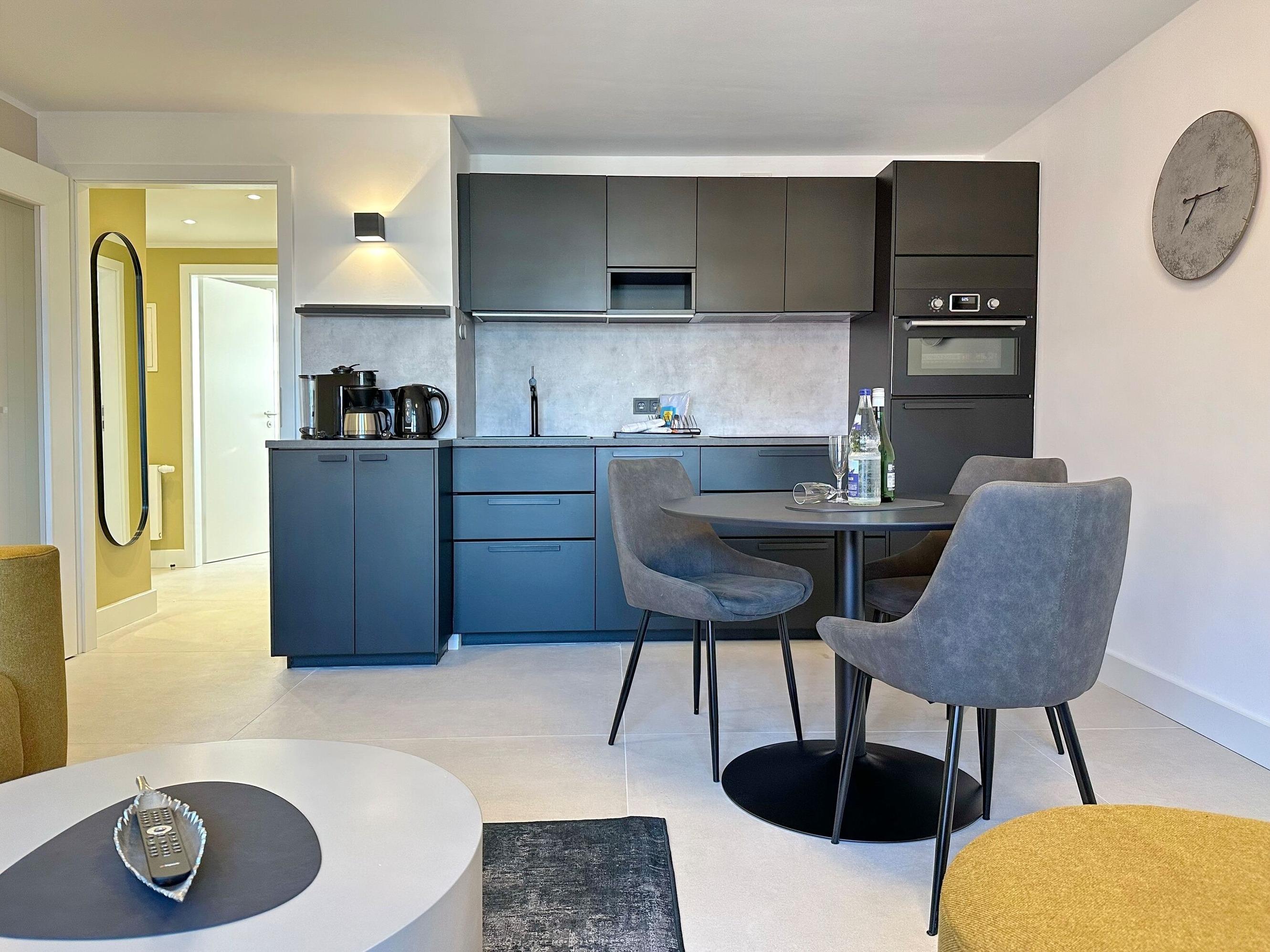 Die Wohnanlage "Olympia" bietet eine zentrale Lage in kurzer Entfernung zur Promenade, dem Badestrand und dem Meer. Auch die Fußgängerzone ist nur wenige Gehminuten entfernt. Die 2-Zimmer-Wohnung liegt im 2. Obergeschoss, wurde im Jahr 2025 von Grund auf renoviert und ist für 2 Personen ideal geeignet. Sie hat eine Größe von ca. 43 m² und besteht aus einem Wohn- und Esszimmer mit Couchecke, Essplatz und integrierter Küche. Die Küche ist mit einem Induktionskochfeld, einem Geschirrspüler und einer Mikrowelle mit Grillfunktion ausgestattet. Vom Wohnzimmer aus gelangt man auf den geschützten und möblierten Südbalkon. Im Schlafzimmer befindet sich ein Box-Spring-Doppelbett, Einbauschränke und ein weiterer Flat-TV. Das moderne Duschbad verfügt über ein Fenster. Im Dielenbereich befinden sich Einbauschränke und eine Garderobe für Jacken und andere Dinge. WLAN steht zur Verfügung, jedoch ohne Gewähr. Das Mitbringen von Haustieren und das Rauchen sind nicht gestattet. Bei Anreise sind Bettwäsche und Handtücher bereits aufgezogen. Die Wohnanlage verfügt über einen Schwimmbad- und Saunabereich sowie einen zusätzlichen Wellnessbereich mit finnischer Sauna, Dampfsauna und Ruhebereich. Fahrzeuge können gegen Gebühr und vorheriger Anmeldung in der Tiefgarage abgestellt werden. Eine Waschmaschine und ein Trockner stehen kostenfrei zur Verfügung. Für Fahrräder gibt es einen Abstellbereich in der Garage.