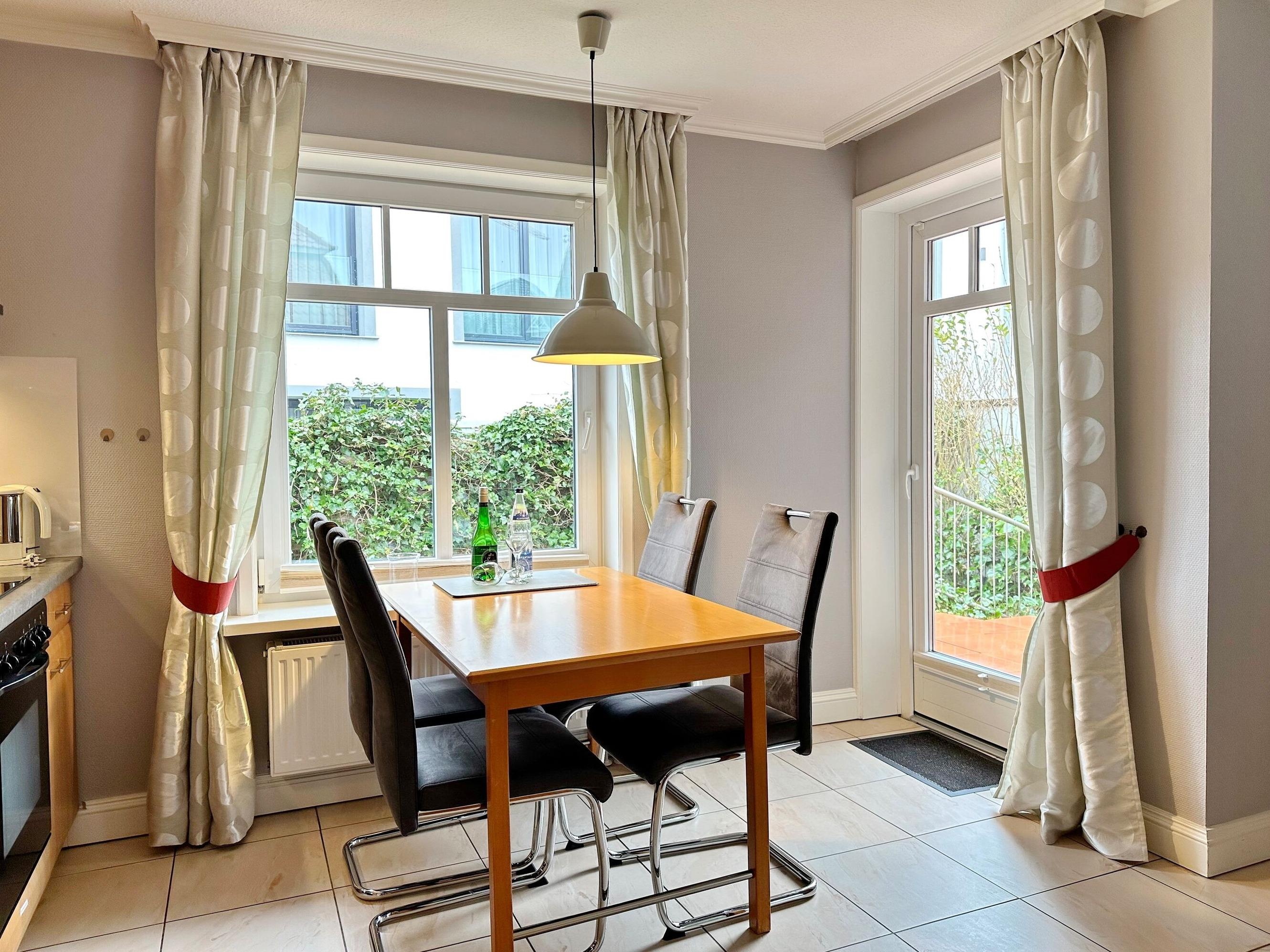 Hübsche 2-Zimmer-Ferienwohnung im Haus "Olympia IV" mit sonniger Südostterrasse, Strandkorb (Apr.-Okt.). Ca. 50m². Nichtraucherwohnung. EG: Wohnzimmer mit Küchenzeile mit Geschirrspüler und Backofen, Doppelschlafcouch und Essplatz für 4 Personen, Duschbad/WC, Schlafzimmer mit Doppelbett, Flur mit Garderobe, Kabel-TV und Radio. Unter Haus 4 befindet sich das Schwimmbad mit Finnischer Sauna. Unter Haus 2 befindet sich ein separater Wellnessbereich mit Dampfsauna, Finnischer Sauna und Ruhebereich. Eine Waschküche mit Gemeinschaftswaschmaschine/Trockner ist vorhanden. Offenes W-LAN-Netzwerk steht zur Verfügung (ohne Gewähr). Bettwäsche und Handtücher sind zur Anreise aufgezogen. Ein Garagenstellplatz kann kostenpflichtig gebucht werden!