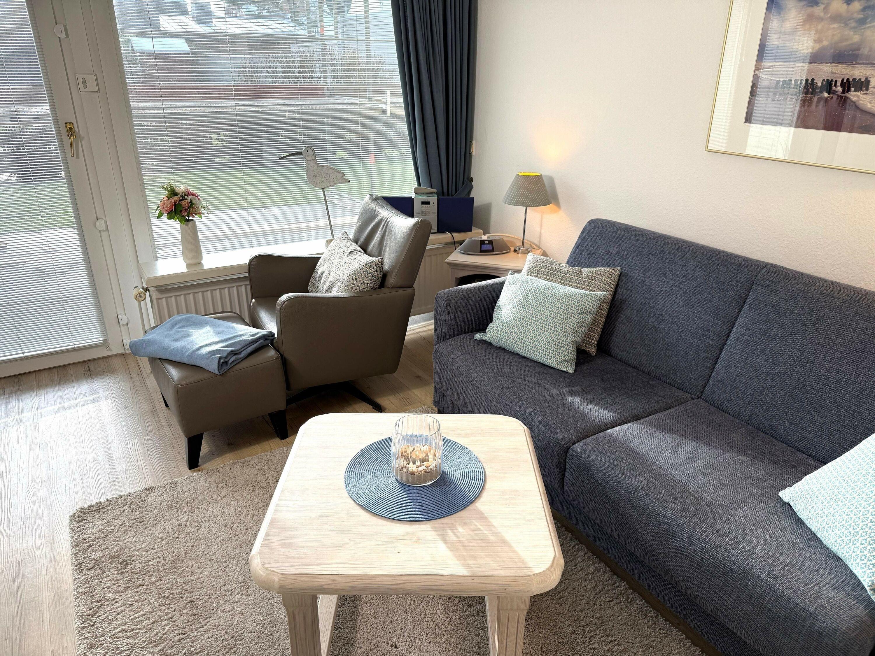 Diese ca. 55?m² große, gepflegte Nichtraucherwohnung bietet Ihnen komfortables Wohnen in zentraler Lage von Westerland – der Strand ist in wenigen Gehminuten erreichbar. Das helle Wohnzimmer überzeugt mit einer Südterrasse samt Strandkorb und elektrischer Markise, einer gemütlichen Sitzecke mit Schlafcouch, Flatscreen-TV, DVD-Player, iPod-Dockingstation, Stereoanlage sowie einem Essplatz für bis zu drei Personen. Ein Internetanschluss steht zur Verfügung (ohne Gewähr). Die offen integrierte Küchenzeile ist hochwertig ausgestattet mit Ceranfeld, Geschirrspüler, Mikrowelle und Nespresso-Maschine. Im separaten Schlafzimmer erwartet Sie ein Doppelbett mit komfortablen Einzelmatratzen sowie ein praktischer Einbauschrank. Das moderne Duschbad mit WC rundet das Angebot ab. In allen Wohnräumen sorgt ein stilvoller Designboden in Holzoptik für eine warme Atmosphäre.
