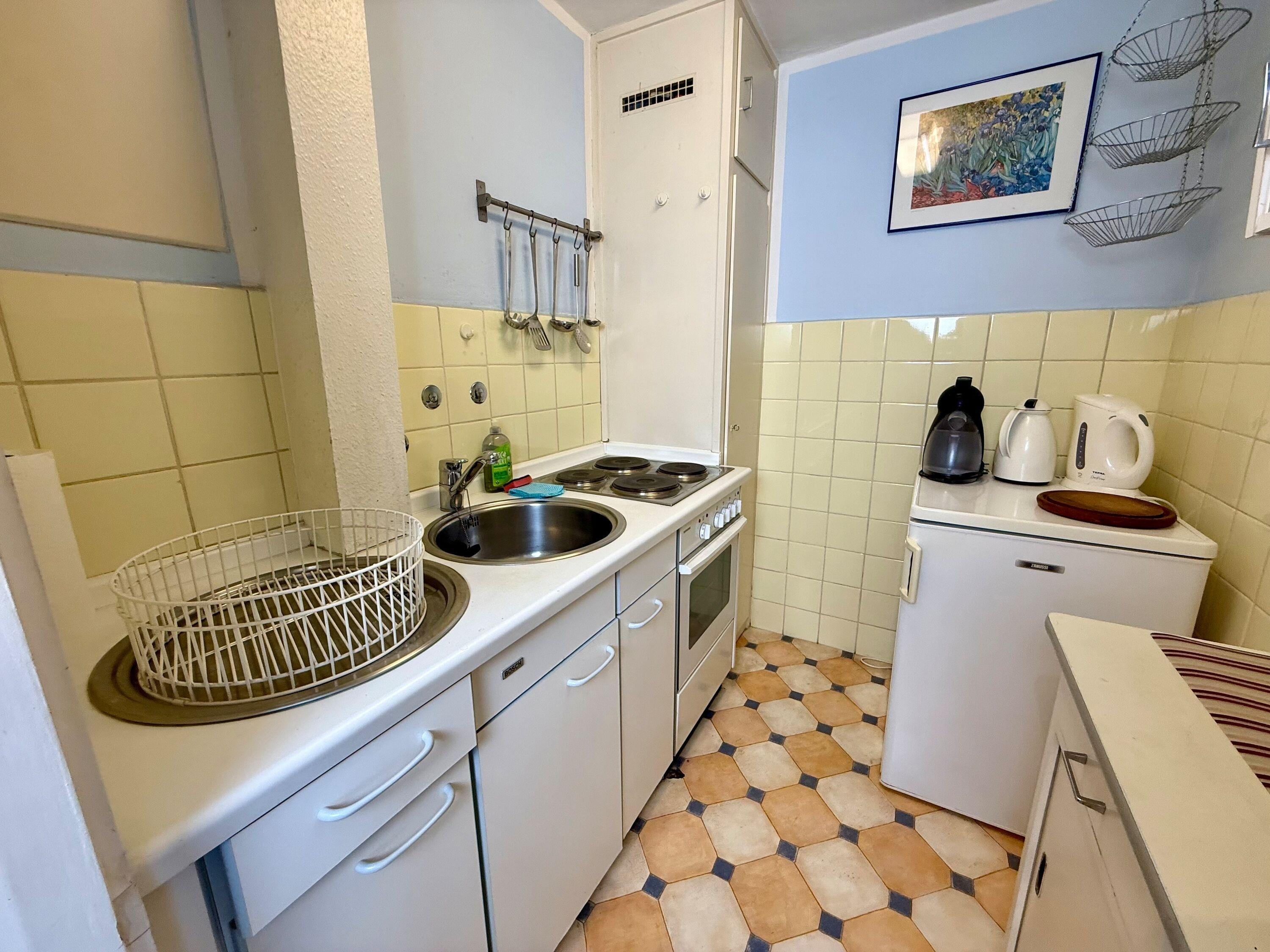 Die separate Küche verfügt über Kühlschrank, Filterkaffeemaschine und Kapselmaschine, sowie Wasserkocher und Toaster.