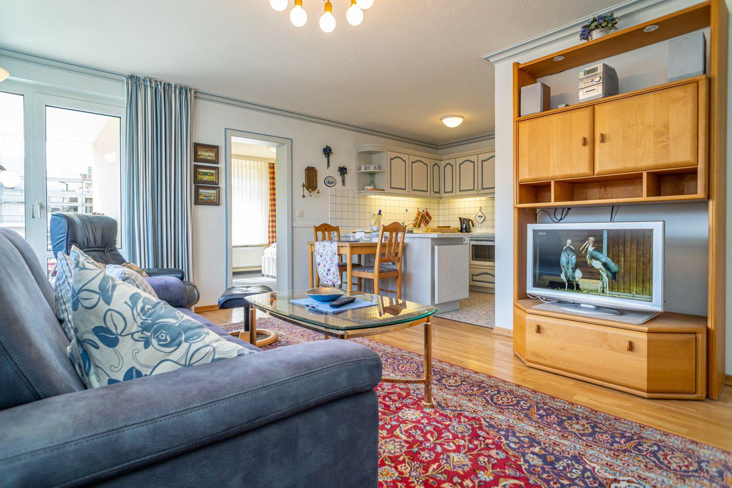 Dieses 2-Zimmer-Appartement (ca. 55 qm) mit offener Küche befindet sich in der 1. Etage, mit Balkon zur Ostseite