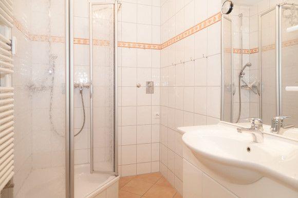 Helles Duschbad/WC mit großem Waschtisch, Handtuchtrockner und Fön.