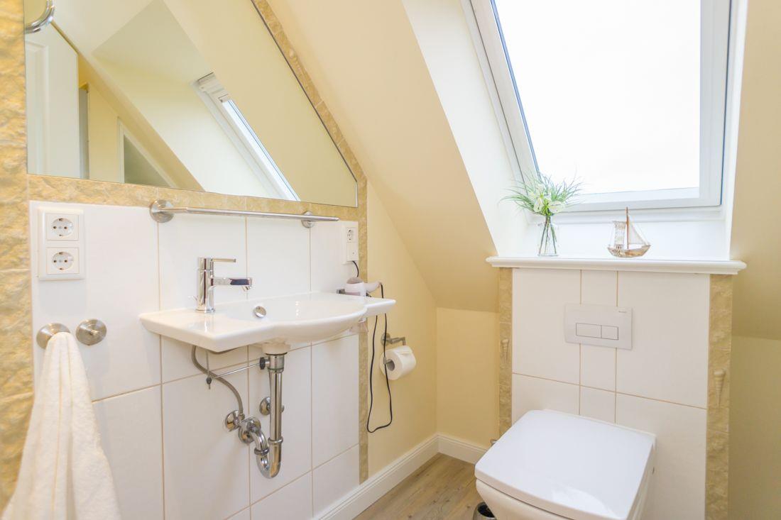 Das Badezimmer ist mit Dusche und WC ausgestattet.