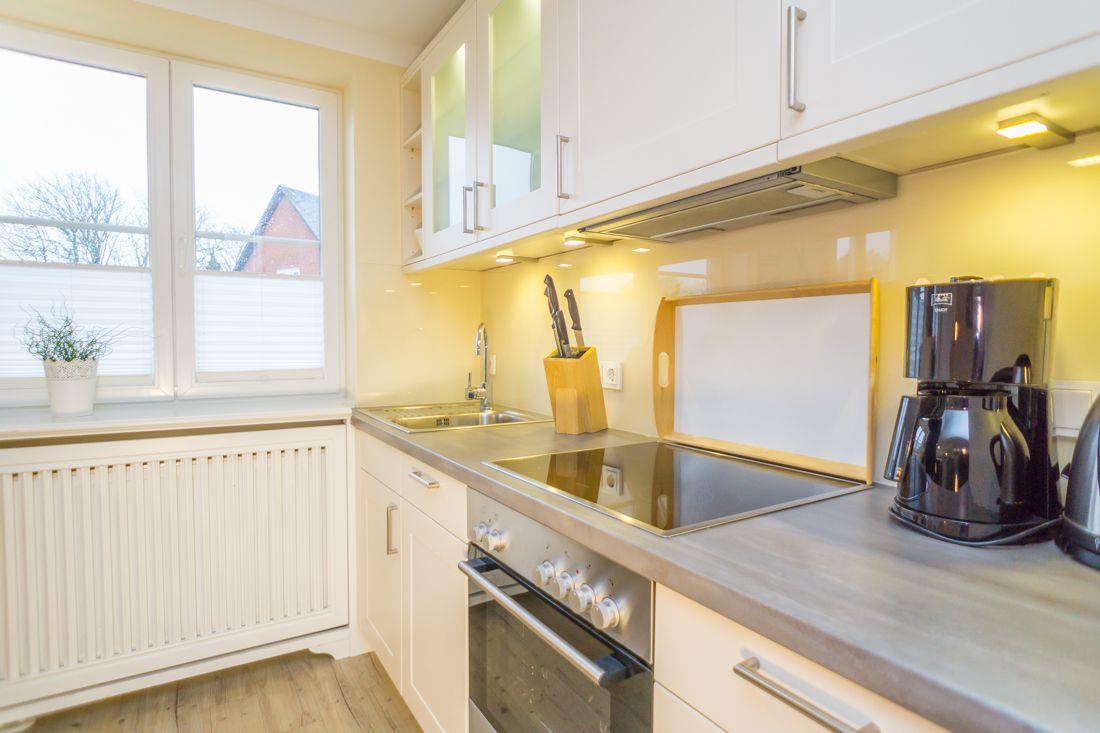 Küchenzeile verfügt u. a. über ein 4er Ceranfeld, Backofen und Geschirrspüler.