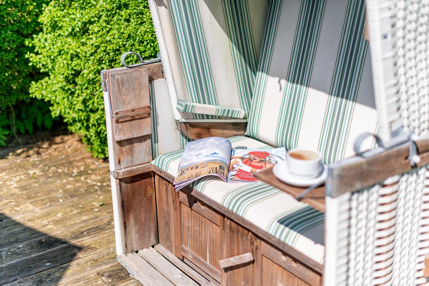 Der großzügige Wohnbereich ist mit einem modernen Sofa und einem TV ausgestattet, ideal für gemütliche Abende nach einem Tag am Strand. Der angrenzende Essbereich bietet ausreichend Platz für zwei Personen. Ein besonderes Highlight der Wohnung ist die sonnige Terrasse mit einem Strandkorb, auf der Sie die frische Nordseeluft genießen können.