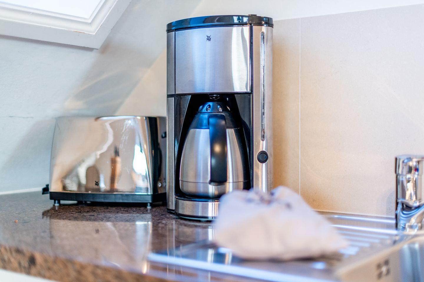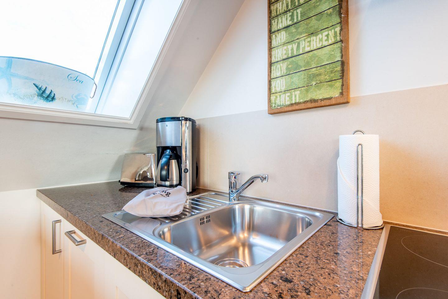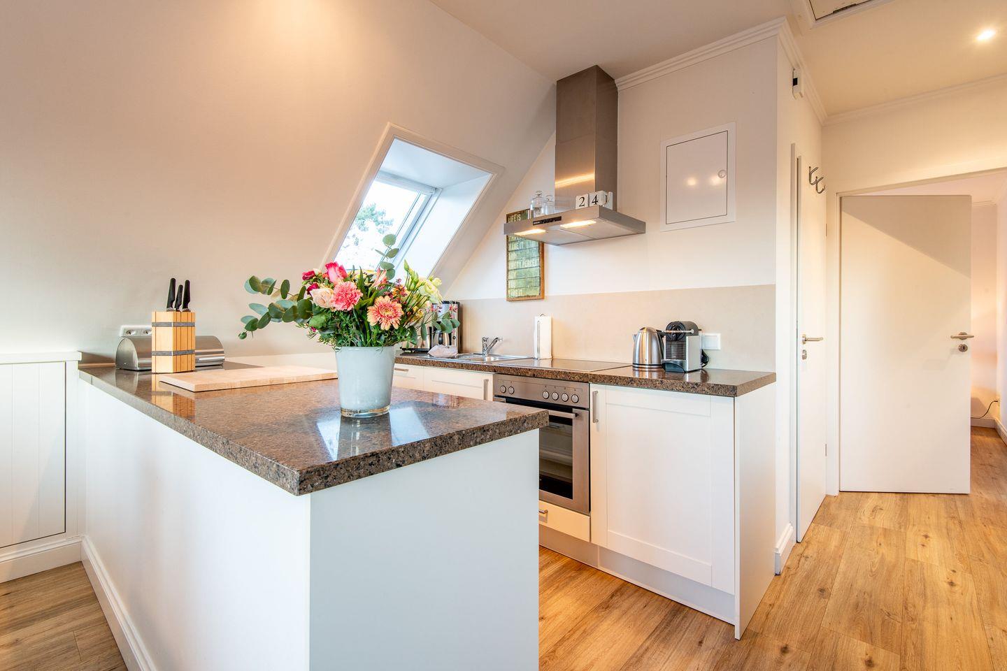 Die offene Einbauküche ist mit modernen Geräten ausgestattet, darunter ein Geschirrspüler, eine Mikrowelle und eine Nespresso-Maschine. Hier finden Sie alles, was Sie für die Zubereitung Ihrer Lieblingsgerichte benötigen.