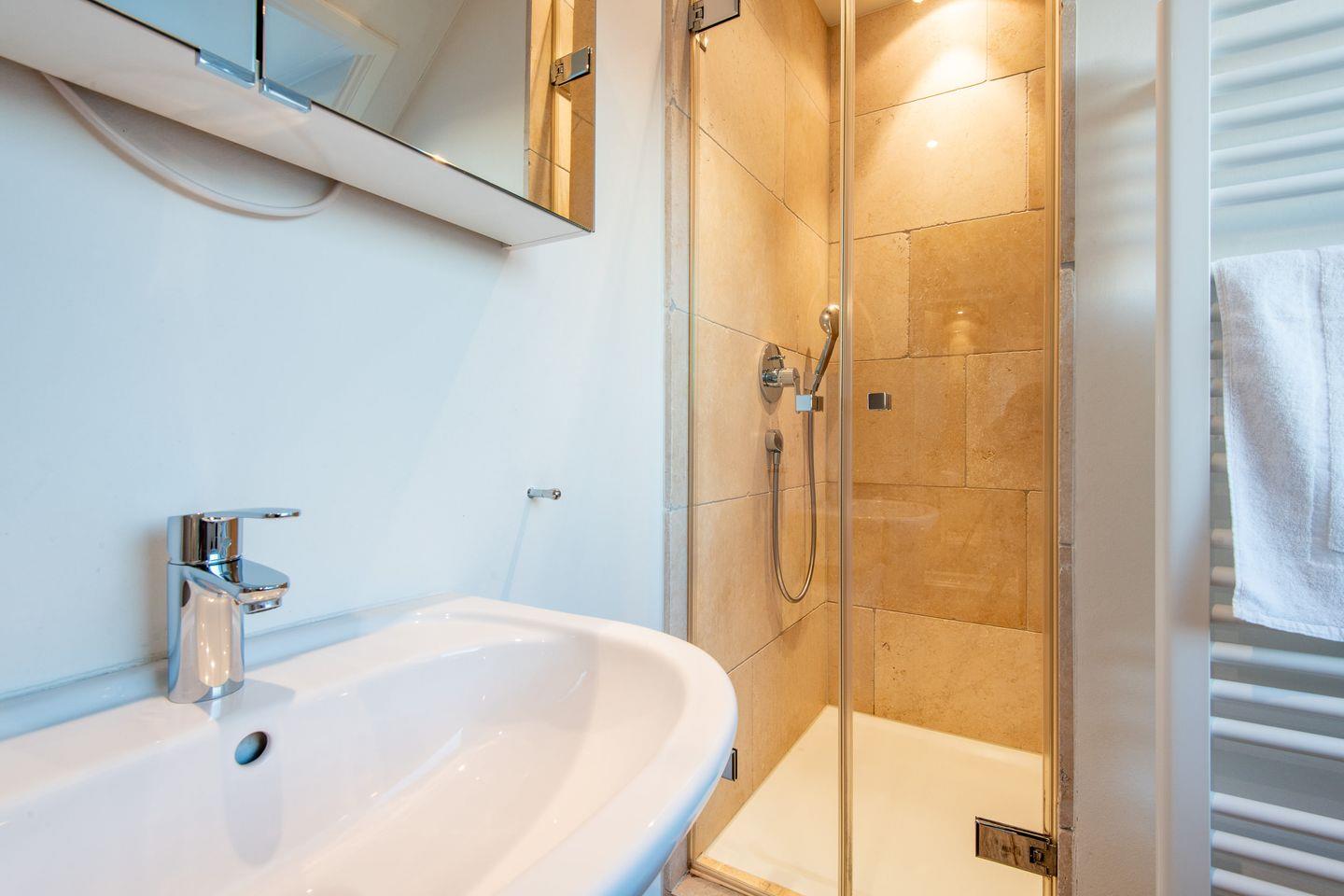 Das gemütliche Schlafzimmer verfügt über ein komfortables Boxspringbett (180x200 cm) und einen TV – der perfekte Rückzugsort für erholsame Nächte. Das moderne Badezimmer bietet eine Regendusche, eine Badewanne, ein WC, einen Föhn und einen Handtuchwärmer – ideal für entspannte Momente nach einem erlebnisreichen Tag.
