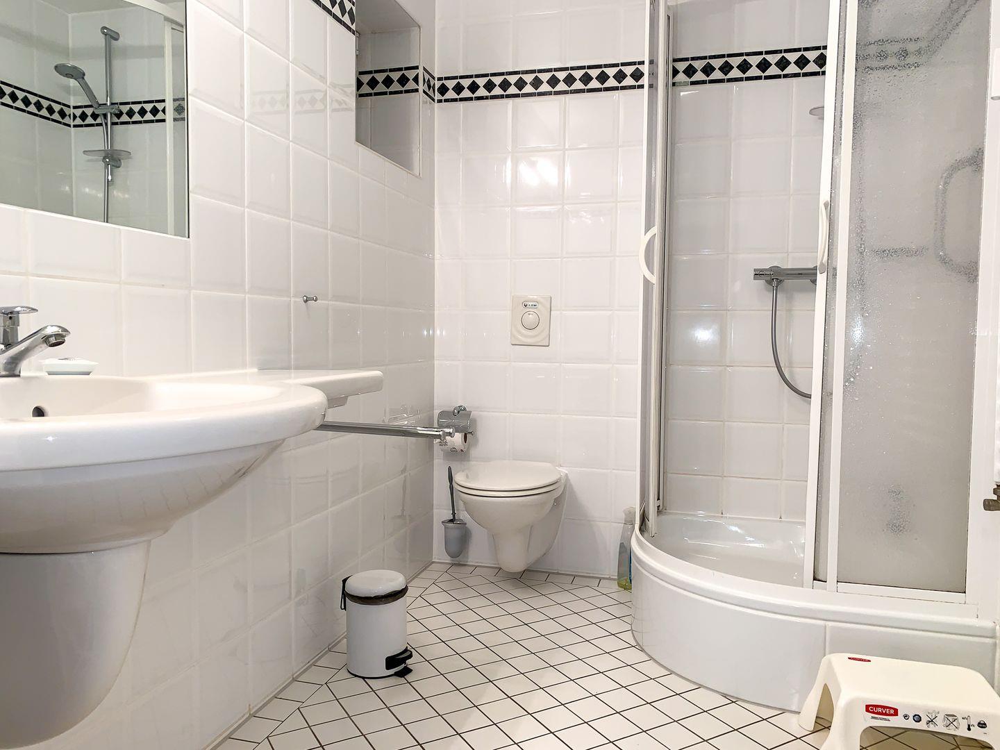 Duschbad und ein weiterer geräumiger Schlafraum mit Doppelbett und TV.