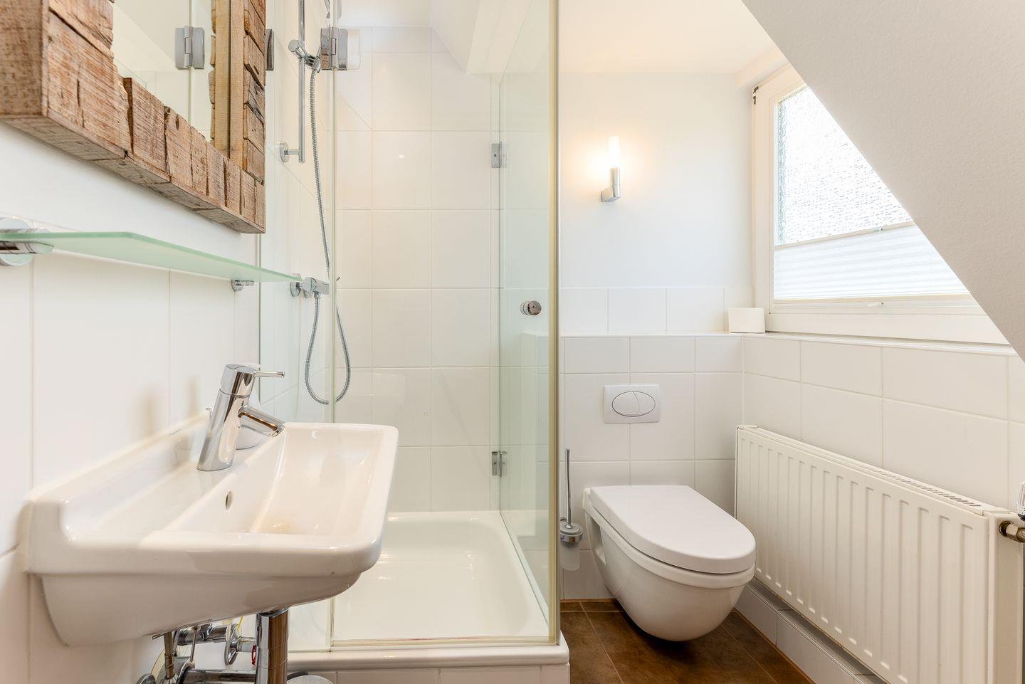Hier wurde alles passgenau vom Tischler angefertigt und der Raum dadurch aufs Beste genutzt. Kein Schnickschnack nur ein paar ausgewählte maritime Accessoires lenken den Blick auf das Wesentliche, in diesem Fall das gemütliche Doppelbett (1,40 x 2,00m) samt seiner rückenfreundlichen Matratze. Dazu noch ein Einbauschrank, der genug Platz für die Urlaubsgarderobe bietet sowie ein kleiner Tisch mit Stühlen. In dem modernen Duschbad werden mit Sand und Weiß sanfte Töne angeschlagen und der Start in den Tag könnte hier kaum besser sein. Zusammengefasst das perfekte Zimmer für eine kleine Auszeit auf Sylt!