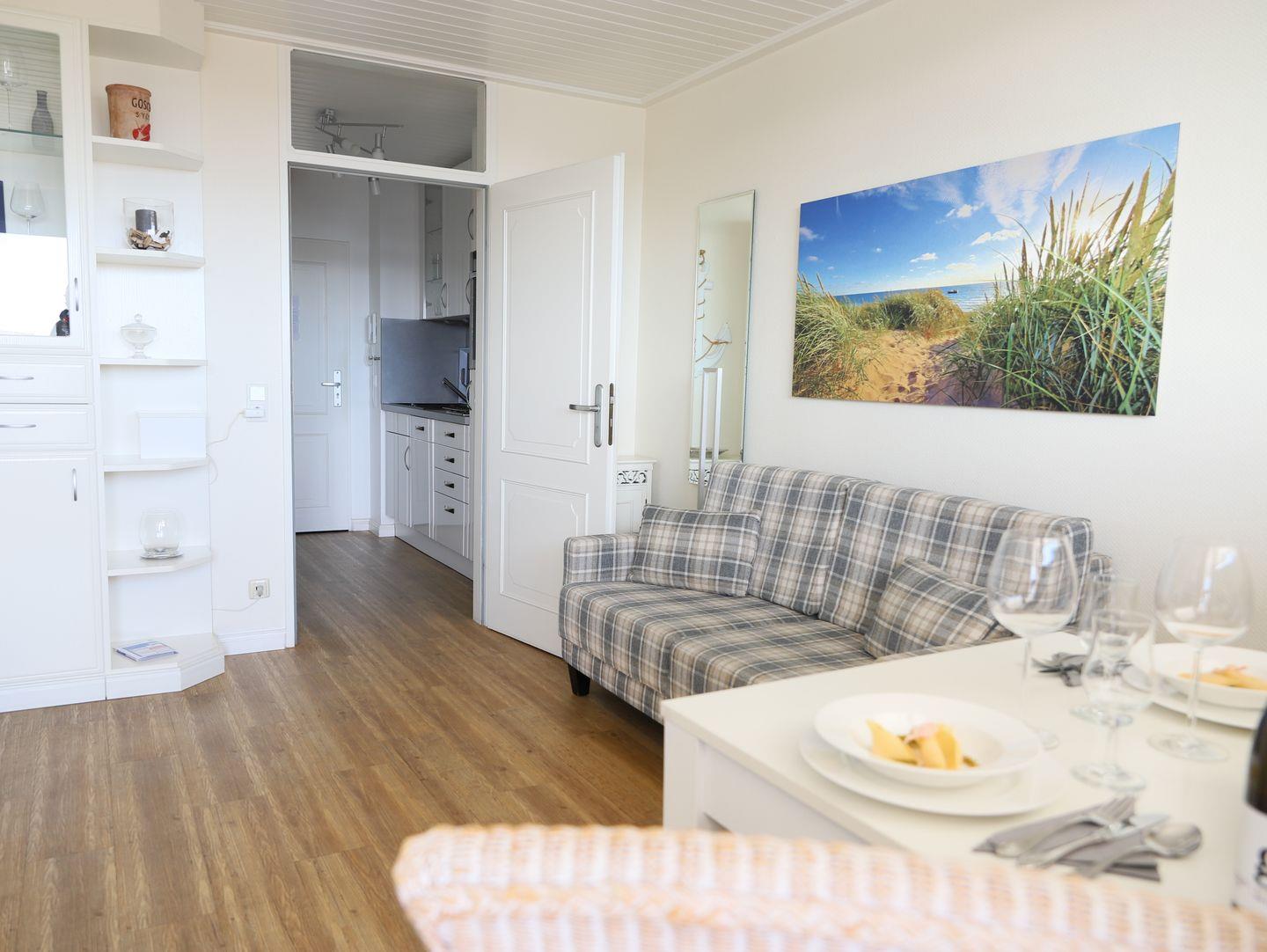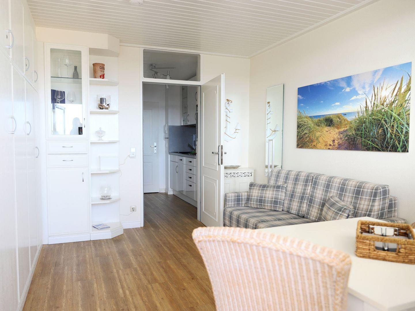 Kompaktes Appartement (ca. 29 m²) in Westerland für 2 Personen. 1 kombinierter Wohn-/Schlafbereich, 1 Badezimmer, Ostbalkon. Nur wenige Gehminuten zum Strand, Bahnhof und Einkaufsmöglichkeiten. Stellplatz auf Parkdeck (kostenfrei), Waschmaschine und Trockner mit Münzzähler.