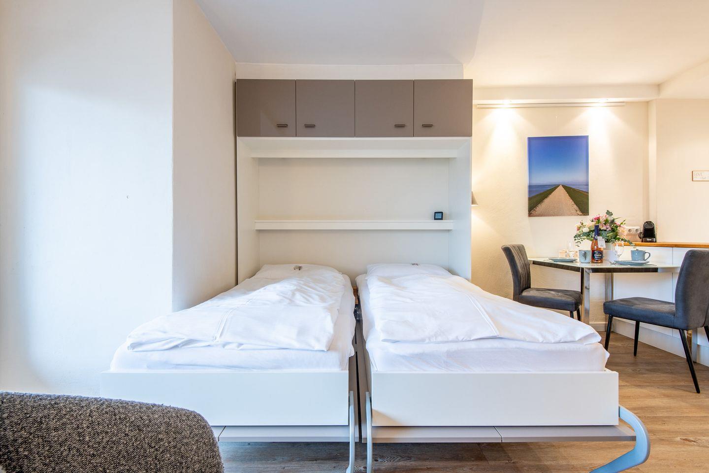 Das Wohn-/Schlafzimmer ist funktional und gemütlich gestaltet. Hier finden Sie ein Schrank-Doppelbett, welches auch als Einzelbett ausgeklappt werden kann und sich tagsüber platzsparend verstauen lässt, ein Sofa und einen Sessel sowie einen TV. Der angrenzende Essbereich bietet Platz für 2 Personen, und über den direkten Zugang zum Nord-Balkon können Sie die Nordseeluft genießen.