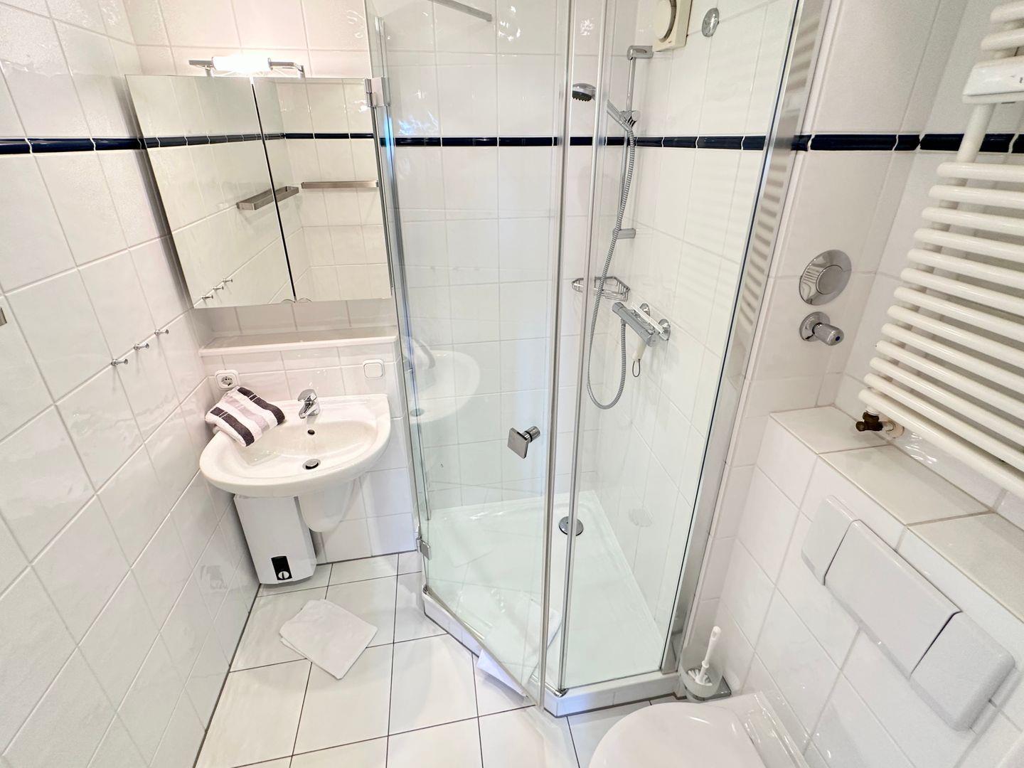 großzügige Eckdusche, Waschbecken, Spiegelschrank und WC. Ein Fön steht Ihnen