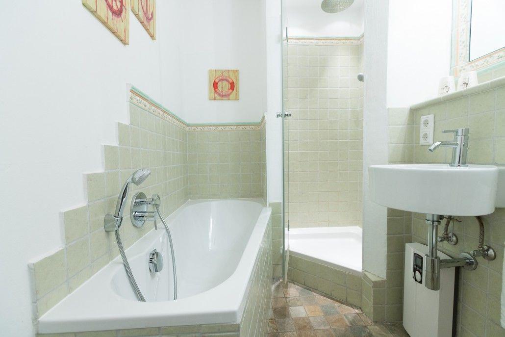 Badezimmer ist mit einer Badewanne und einer separaten Dusche ausgestattet,