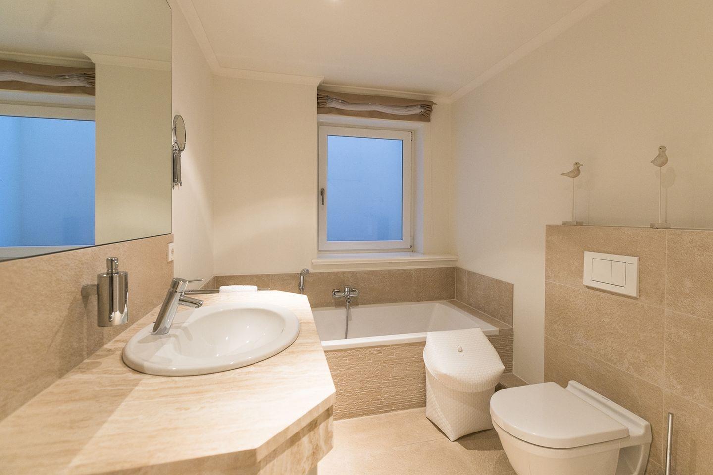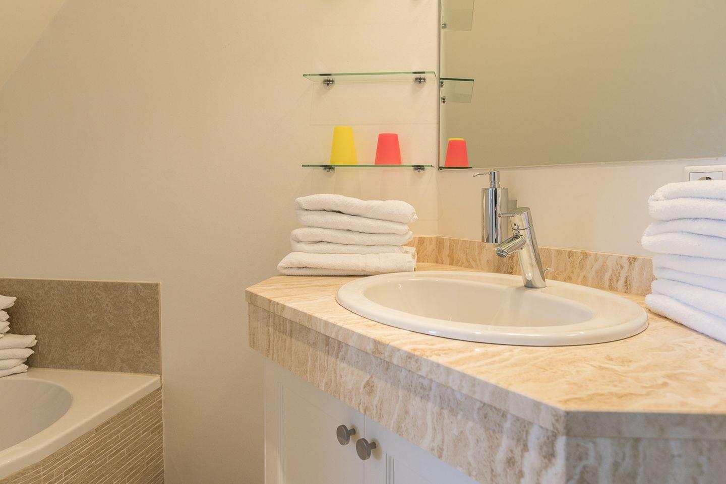 Zwei moderne Badezimmer mit Badewanne, WC und separater Dusche – eines im Untergeschoss und eines im 1. OG – ideal für Familien oder Gruppen.