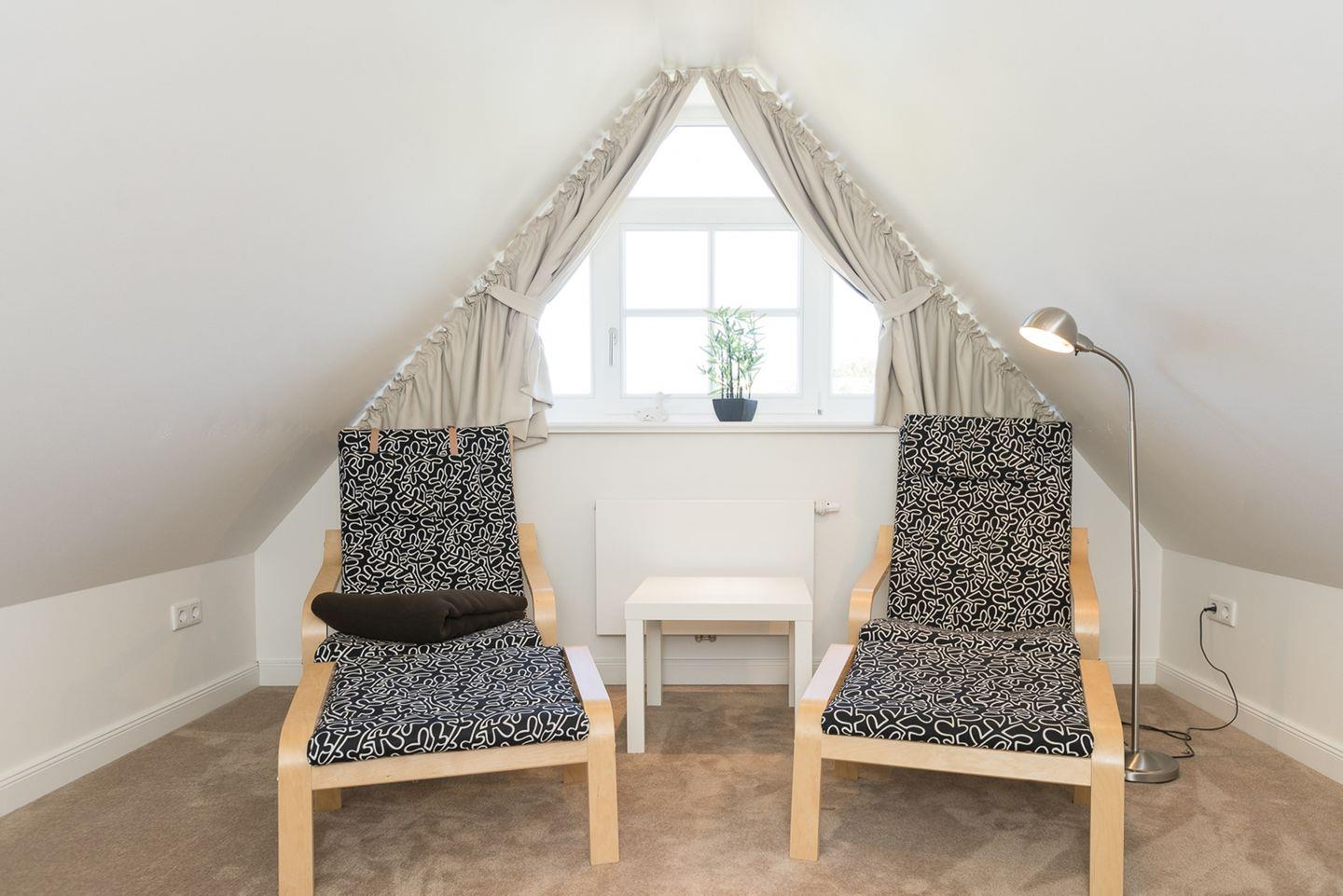 Zusätzlicher Wohnraum im Dachgeschoss mit Relax-Sesseln und Flat-TV als gemütlicher Rückzugsort für ruhige Lesestunden oder Entspannung am Abend.