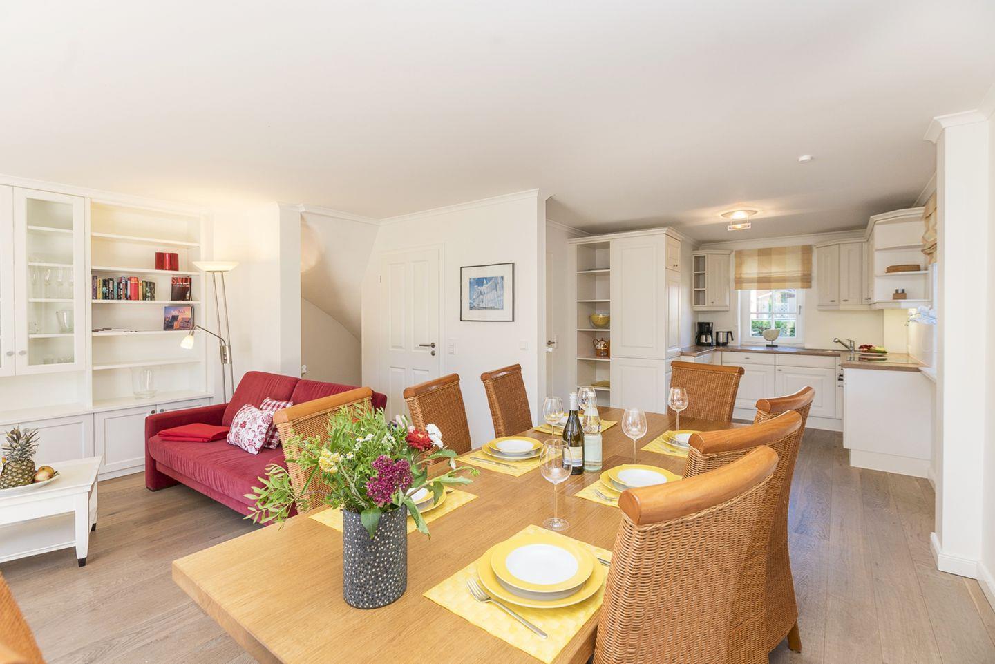 Großzügiges Wohn- und Esszimmer im Erdgeschoss – der offene Raum ist perfekt für gemeinsame Stunden mit bis zu 8 Personen. Großzügige Sitzmöglichkeiten, Essplatz und eine einladende Atmosphäre machen diesen Bereich zum Herzstück Ihres Urlaubs.