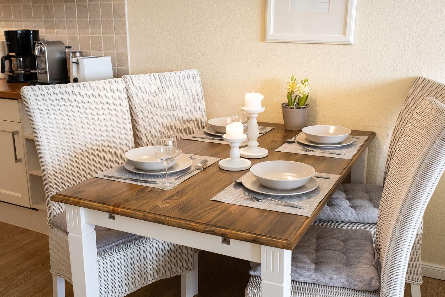 Die ca. 54 m² große 2-Zimmer-Ferienwohnung befindet sich im 2. Obergeschoss des Hauses Norderhoog und ist bequem über den Fahrstuhl erreichbar. Der helle Wohn- und Essbereich lädt mit einer gemütlichen Sitzgruppe und einer komfortablen Schlafcouch zum Entspannen ein. Die angrenzende moderne Küchenzeile ist gut ausgestattet und bietet alles, was Sie für eine unkomplizierte Selbstversorgung im Urlaub benötigen.