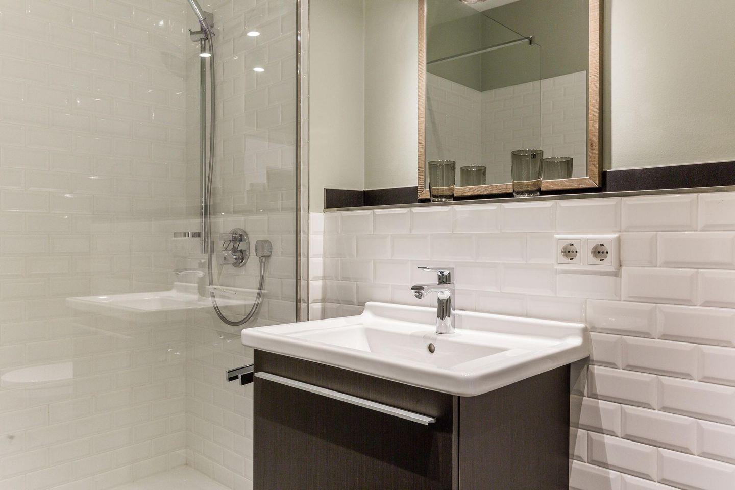 Das moderne Badezimmer ist mit einer Dusche, WC, Fön und Handtuchwärmer ausgestattet und sorgt für einen angenehmen Start in den Tag.