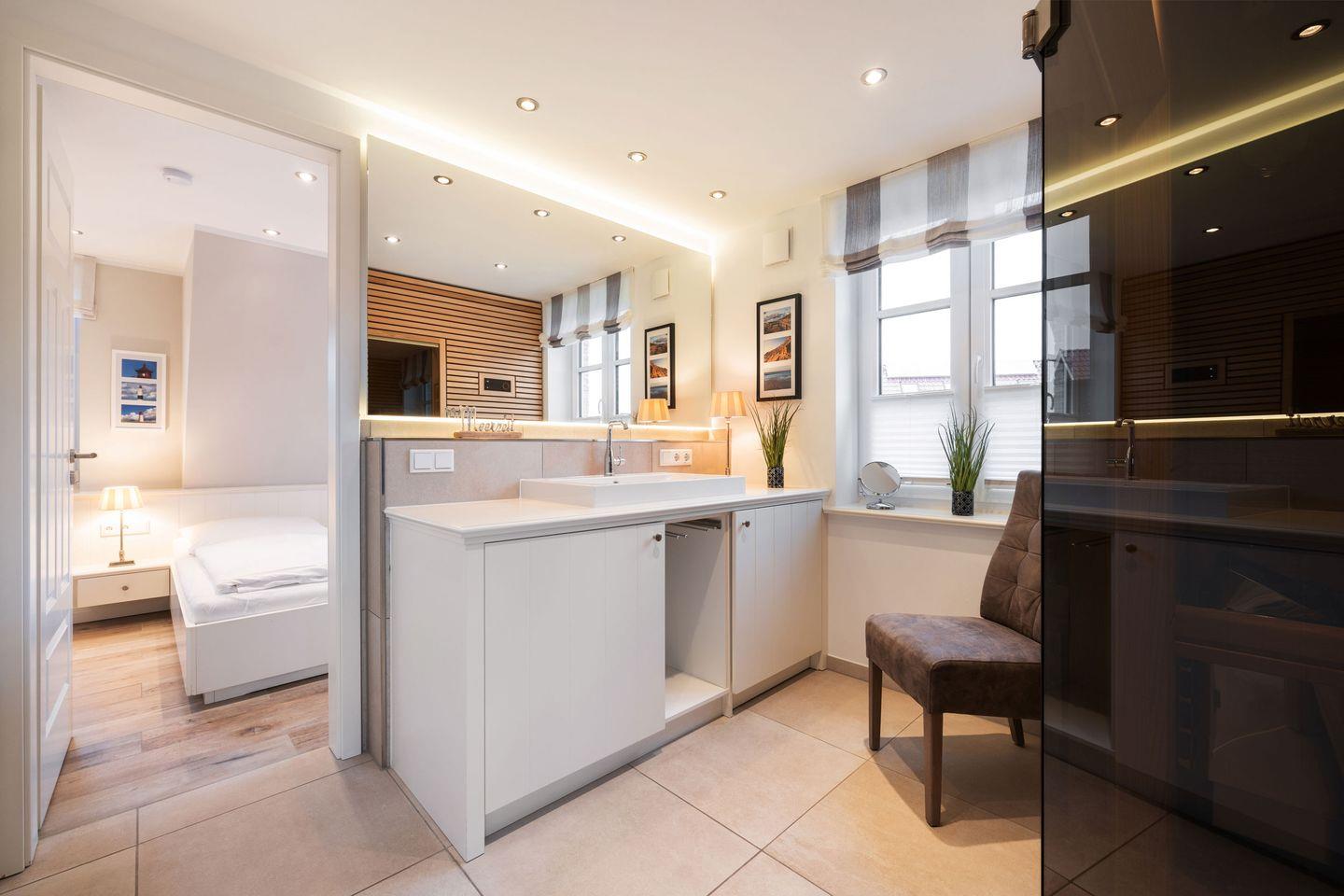 Das Badezimmer ist mit einer ebenerdigen Dusche, einem WC, einer Sauna und einem Waschtrockner ausgestattet. Ein Handtuchwärmer, Föhn und Tageslicht sorgen für zusätzlichen Komfort, und ein direkter Zugang zum Südbalkon ermöglicht entspannende Momente an der frischen Luft. Ein zusätzliches Duschbad mit ebenerdiger Dusche, WC und Tageslicht im Dachgeschoss ergänzt das Wohlfühlangebot.