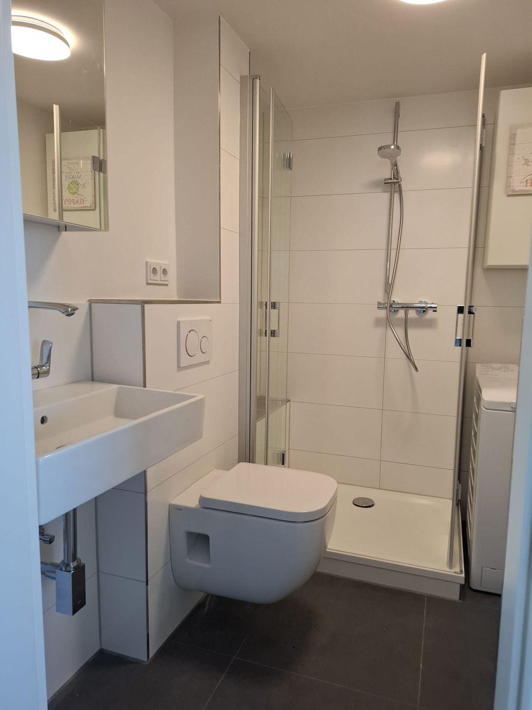 Das ebenfalls sanierte Badezimmer verfügt über eine Dusche, ein WC, großes Waschbecken und Fußbodenheizung. Zudem können Sie in der Toplader-Waschmaschine ihre Kleidung bequem reinigen.