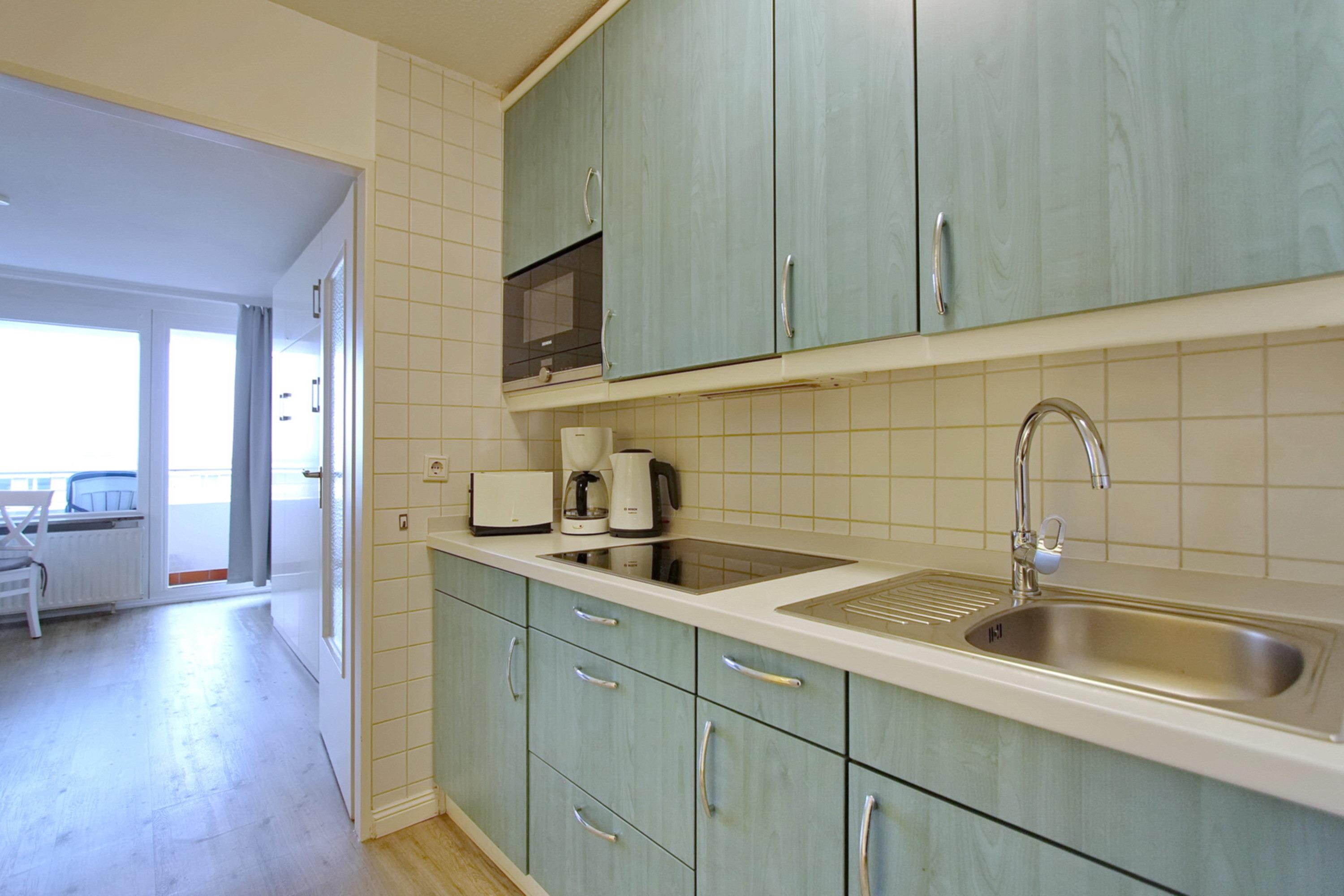 Hell und freundlich eingerichteter Wohn-/Schlafraum in der 5. Etage im Haus Metropol mit vorgelagertem, großen Ostbalkon und bei schönem Wetter einem herrlichen Blick über Westerland. Der neu gestaltete Wohnraum mit Designfussboden hat eine große Schrankwand mit Einzelschrankbetten und Komfortfederkernmatratzen, für einen besonders erholsamen Schlaf. Es gibt einen Essplatz am Fenster mit 2 Stühlen, sowie eine Couch und einen Fernsehsessel mit Fußhocker für gemütliche Fernseh- oder Leseabende. Im Badezimmer gibt es eine Dusche, einen Fön und ausreichend Ablage- und Schrankfläche für ihre persönlichen Dinge. Die Einbauküche im Flur verfüg über einen modernen Induktionsherd mit 4 Kochplatten sowie eine Mikrowelle mit Grillfunktion. Zur technischen Ausstattung dieser Wohnung gehört ein Flachbildfernseher, ein Bluetooth Radio mit CD Player. Der freie WLAN Hot Spot (WEG Haus Metropol - Passwortfrei - ohne Gewähr) steht ihnen kostenfrei zur Verfügung. Wohnungsgröße: ca. 30 m².